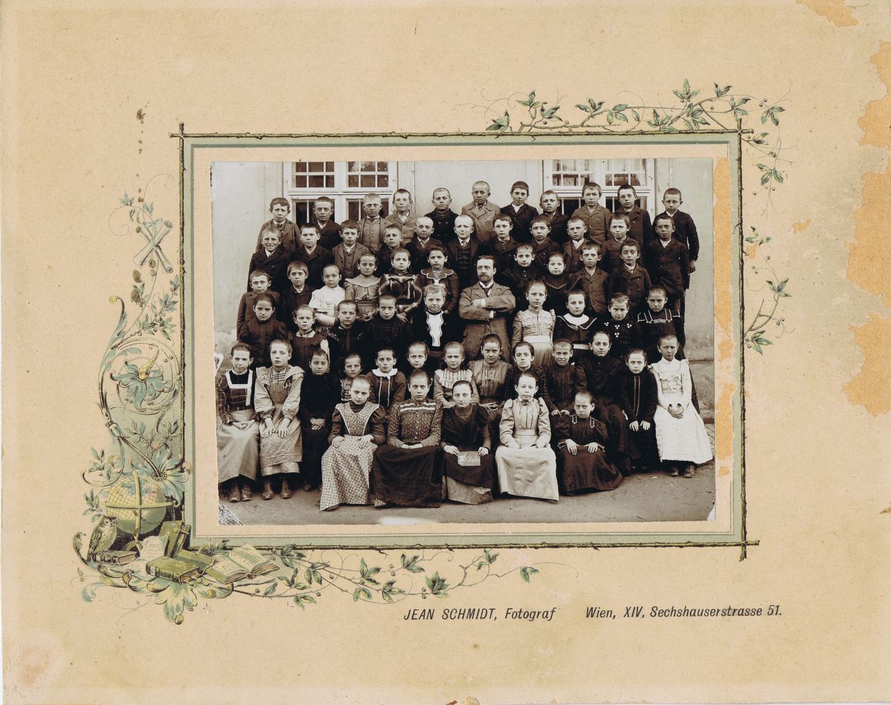 Auf Karton geklebte Fotografie mit Darstellung der Feuerwehrmänner in Uniform sowie auch vier Personen mit Hut (örtlicher Arzt und Beirat, ein weiterer Beirat, der örtl. Gastwirt sowie der Herr Bürgermeister) aus dem Jahr 1894. Auf dem Karton befindet sich eine Rahmengraphik und Zentral eine Graphik mit Feuerwehrsymbolik. Auf der Rückseite befindet sich ein handgeschriebener Zettel welcher einerseits alle Personen nennt und andererseits den Hinweis auf das "10 Jahre Gründungsfest" liefert.
