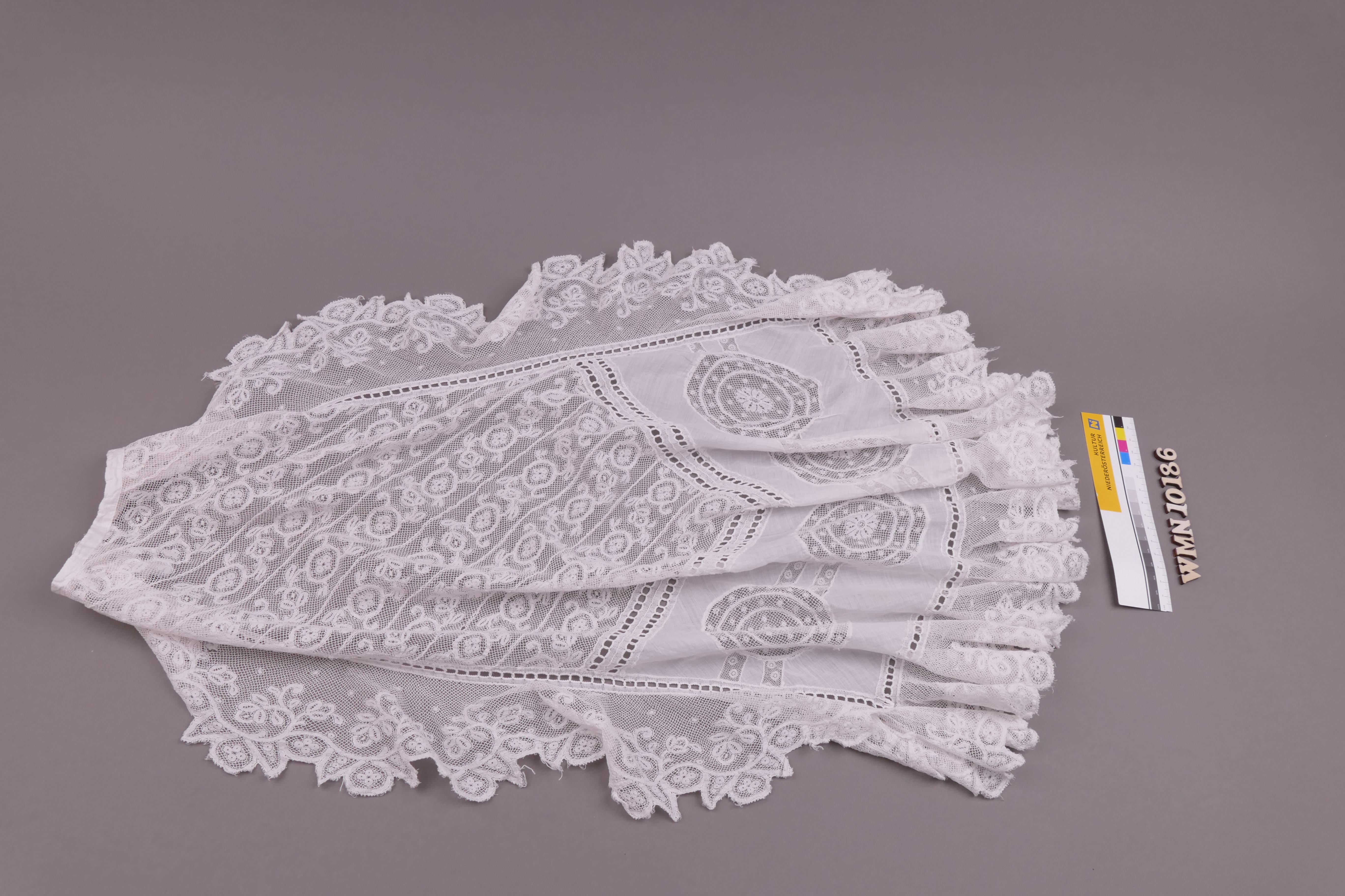 weiß; tropfenförmig; Mittelteil: Spitzeneinsätze und Durchbruchkante; an drei Kanten: gerüschte Spitzenborte als Randabschluss; an einer kurzen Seite: 1 Perlmuttknopf