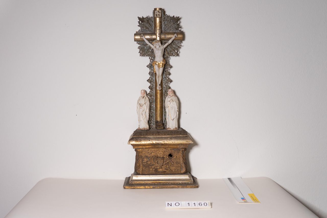 aufziehbare Spieluhr in Form eines Kruzifixes mit Jesus am Kreuz und zwei Frauen. Auf einem Sockel angebracht, hinter dem sich die Spieluhr befindet. Über ein Loch im Sockel wird die Spieluhr mittels Schlüssel aufgezogen. Figuren aus weißer, bemalter Keramik, Spieluhr aus Holz, Elemente aus Metall.
