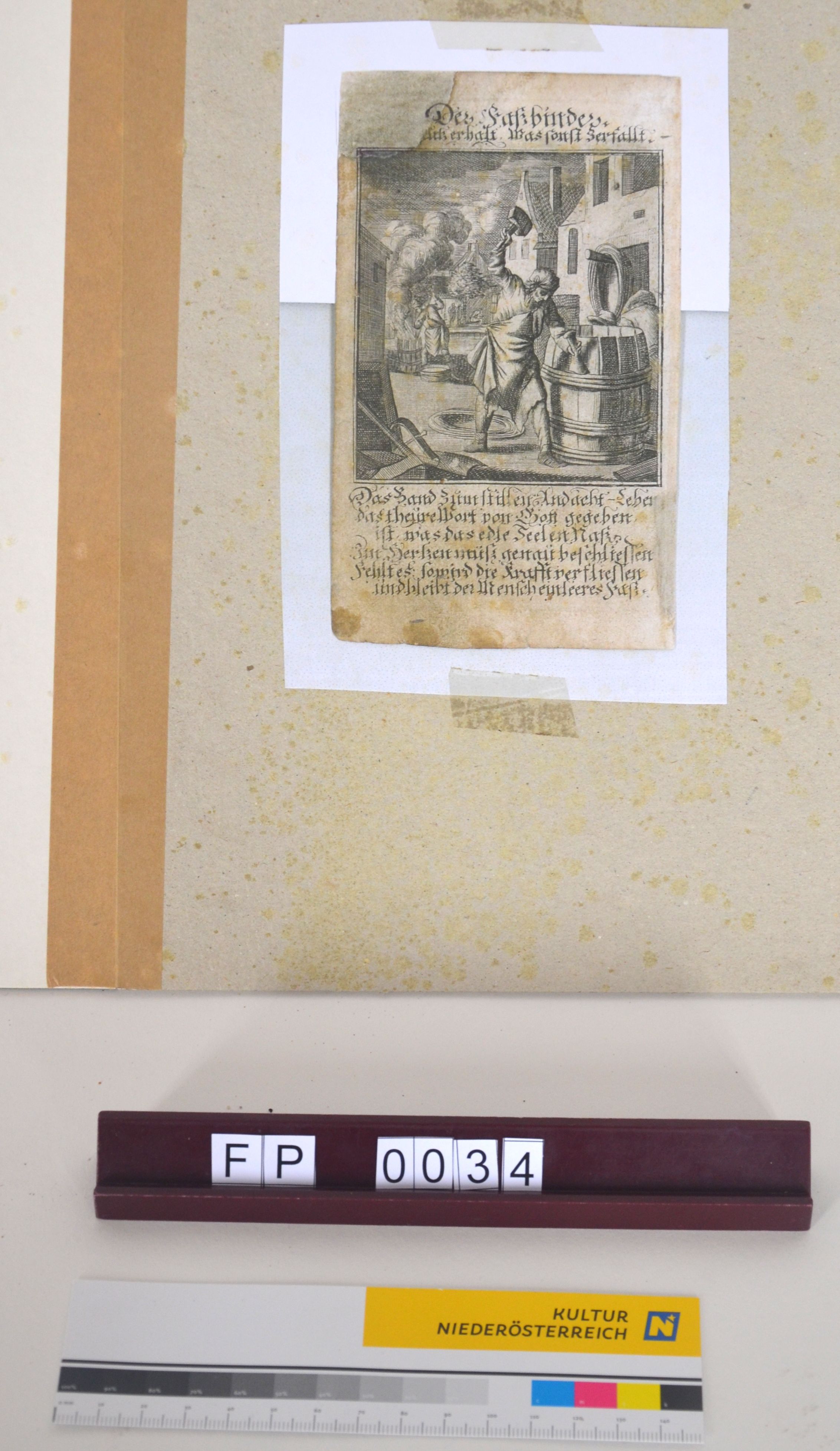 Kupferstich, Wien um 1700, Fassbinder bei der Arbeit Bei dieser aus einer Spruchsammlung des Barockpredigers Abraham a Santa Clara stammenden Illustration ist im Vordergrund der Zusammenbau eines Fasses mit hölzernen Reifen, im Hintergrund das Ausfedern zu sehen.