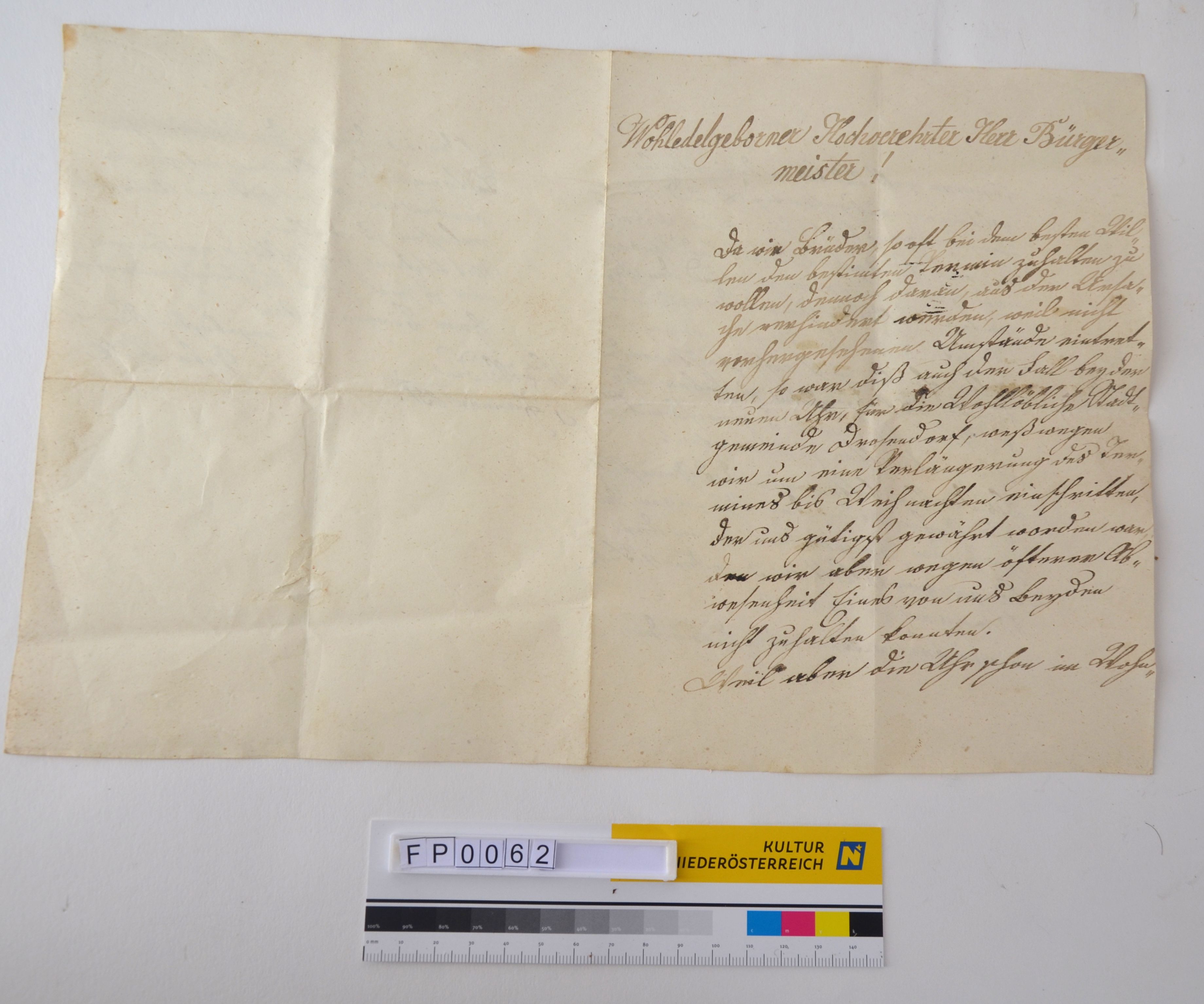SCHREIBEN DER GROSSUHRMACHER BÖCK IN NEUPÖLLA Doppelblatt, Neupölla am 21. Jänner 1851. In der ersten Hälfte des 19. Jahrhunderts existierte in Neupölla eine im ganzen Waldviertel tätige Großuhrenproduktion von Thaddäus Böck und seinen Söhnen Johann sowie Christian. Sie fertigten u.a. die Turmuhren der Pfarrkirchen in Alt- und Neupölla sowie eine im Pfarrhof Altpolla erhaltene Standuhr an. Mit diesem Schreiben an den Bürgermeister von Drosendorf baten die Brüder um eine neuerliche Verlängerung der Lieferungsfrist für die von der Stadtgemeinde Drosendorf bestellte Turmuhr.
