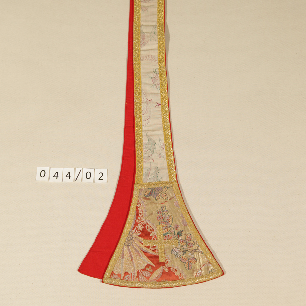 Stola aus weißgrundigem Silberbrokat, Schaufeln roter Goldbrokat, florale Ornamentik, Goldborten; rotes Futter