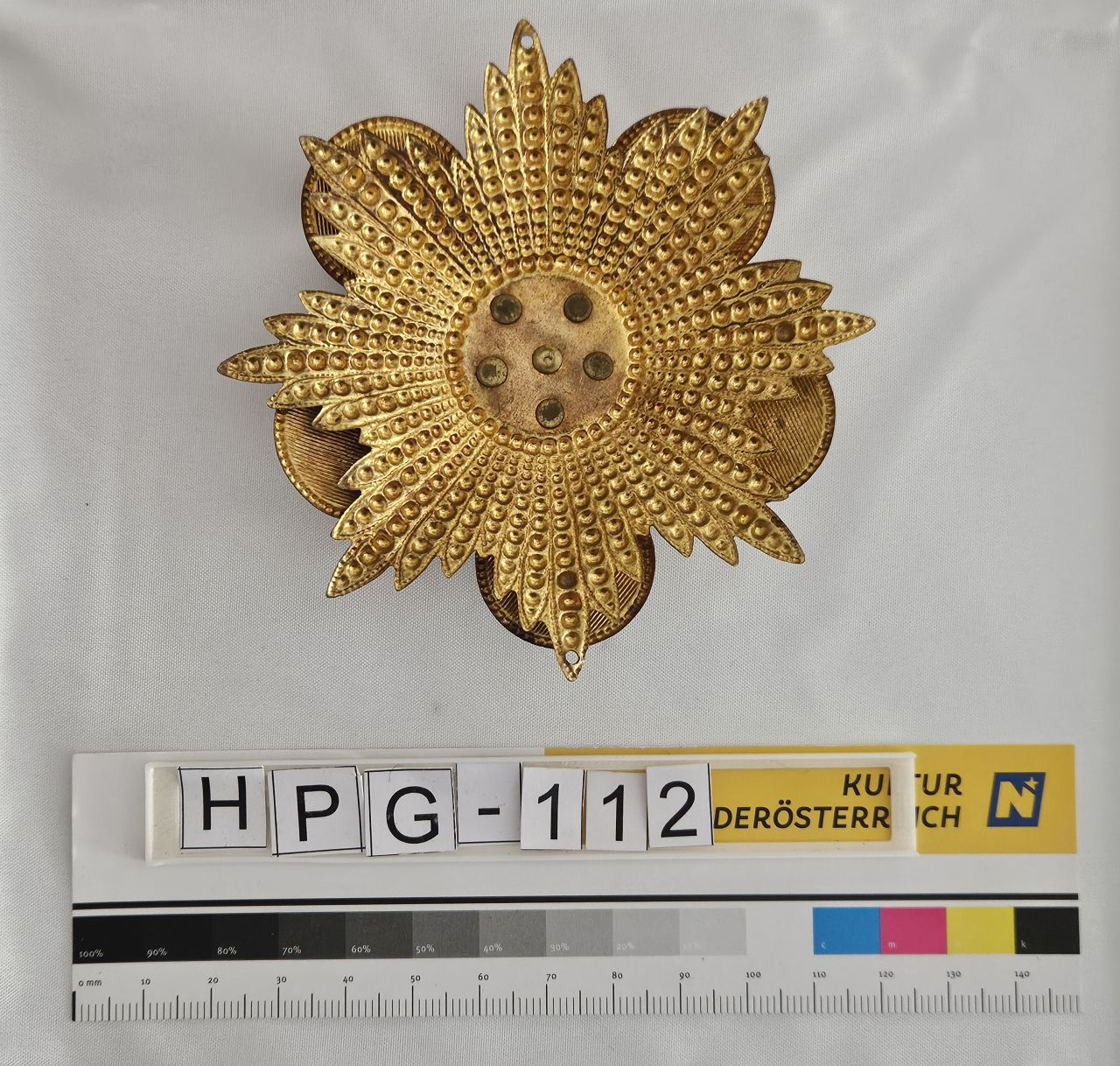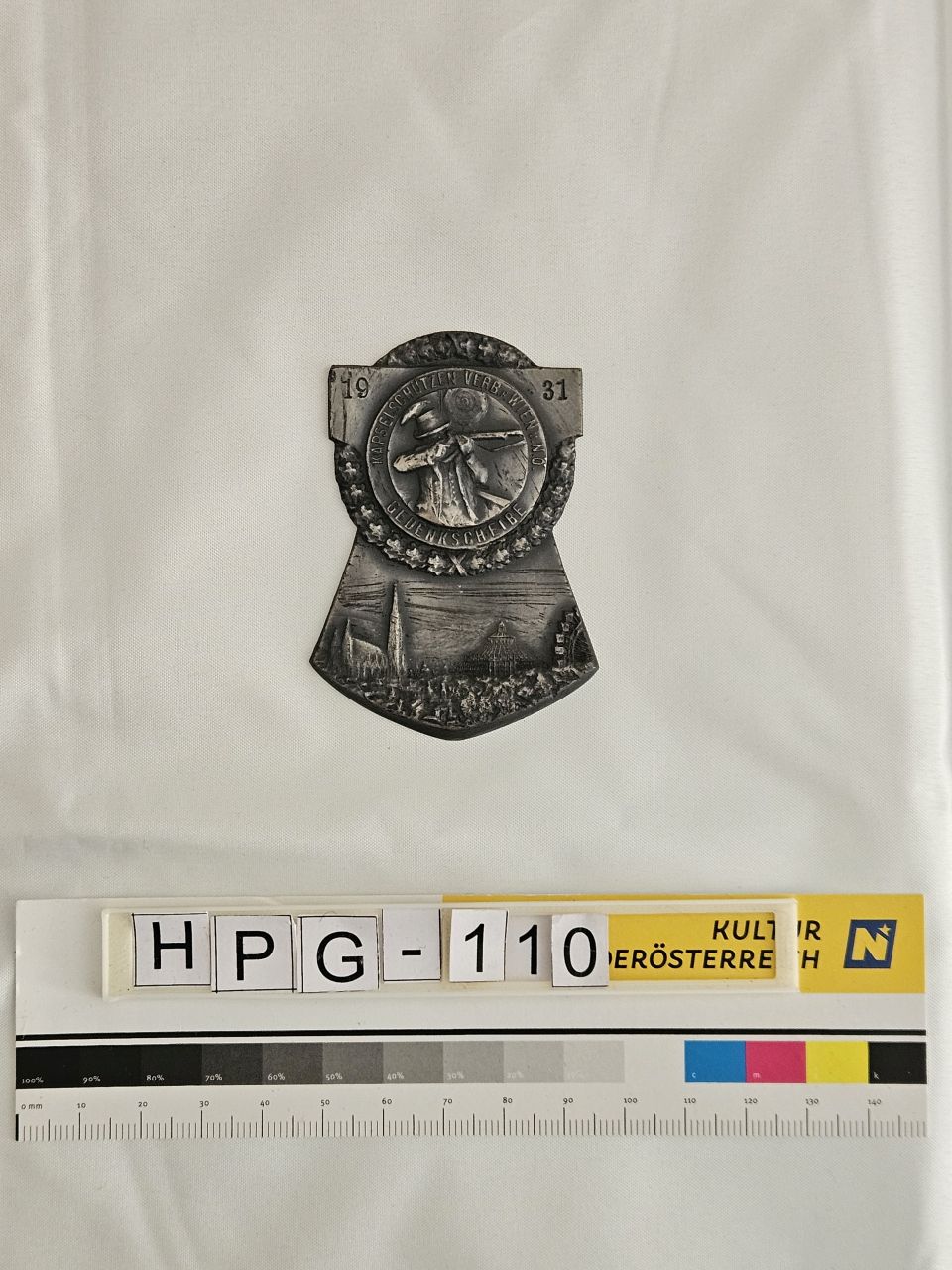 wappenartige, vergoldete Anstecknadel mit dem Schriftzug "F. Kuselbauer Ed."