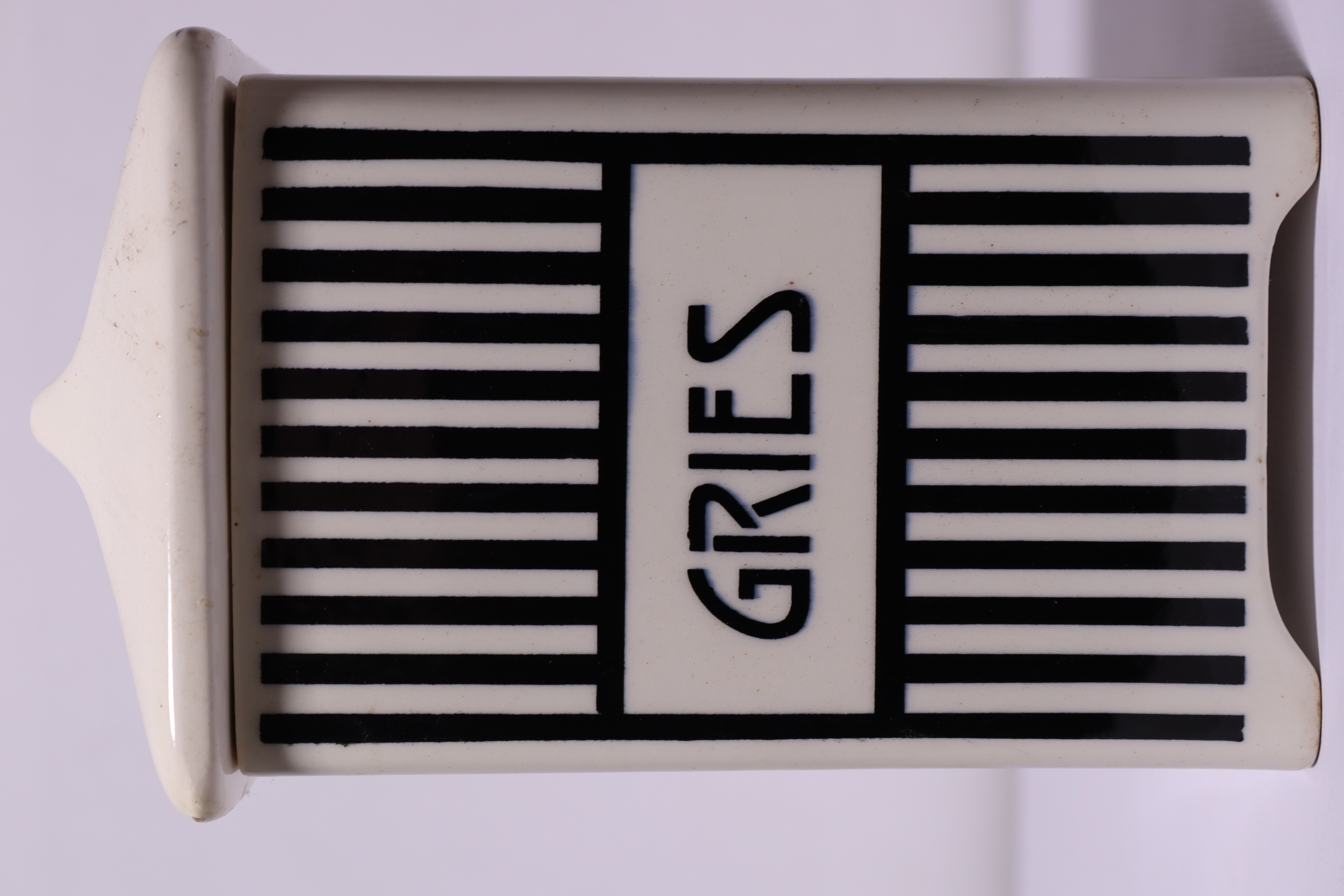 Aufbewahrungsbehälter aus Keramik, schwarz-weiß glasiert mit Aufschrift "Grieß"