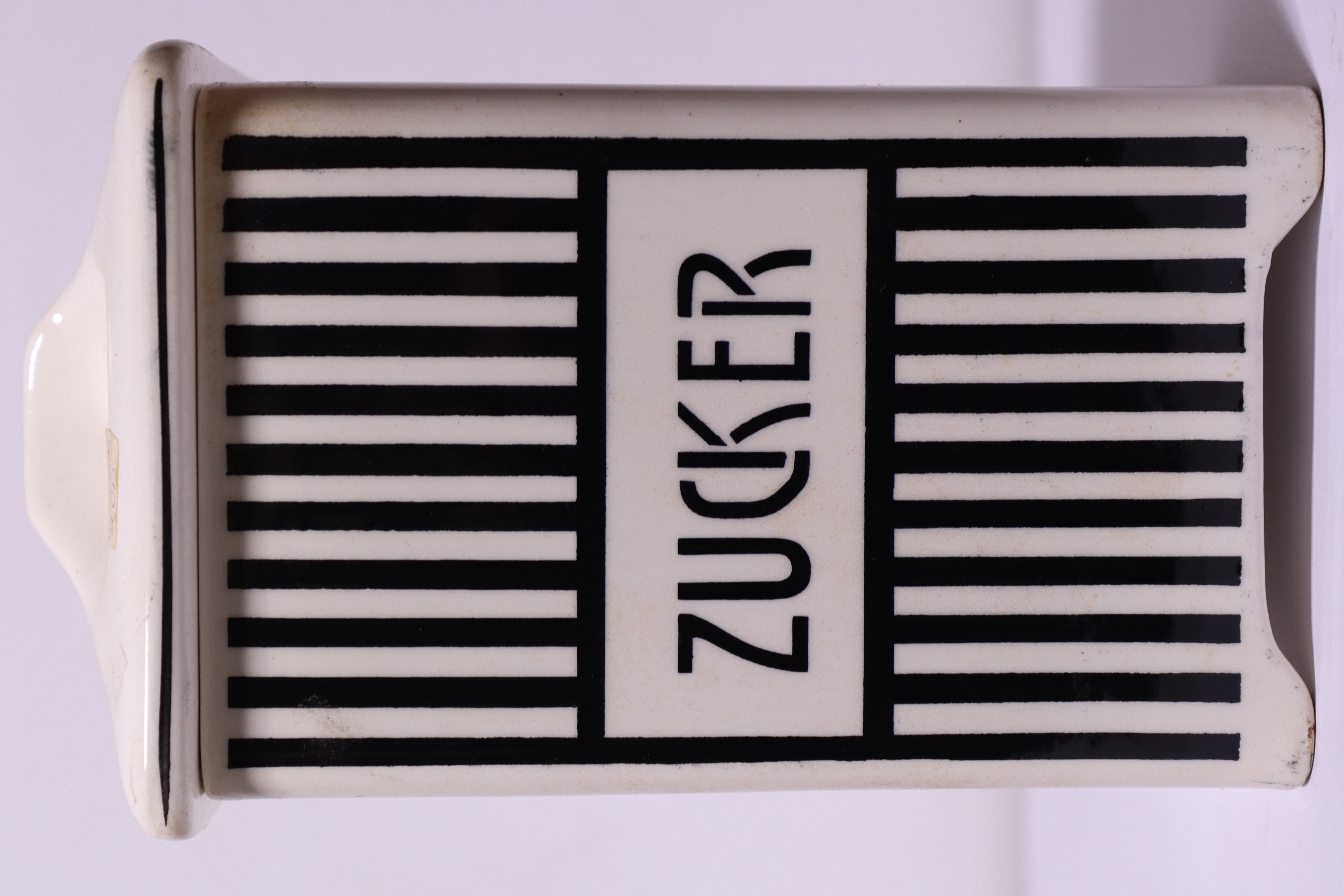 Aufbewahrungsbehälter aus Keramik, schwarz-weiß glasiert mit Aufschrift "Zucker"