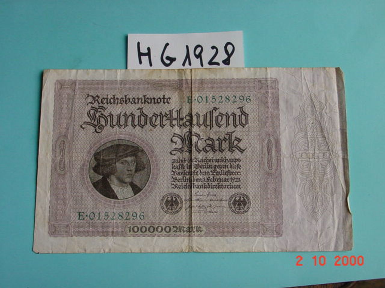 Reichsbanknote über den Wert von 100.000 Mark. Berlin, den 1. Februar 1923.