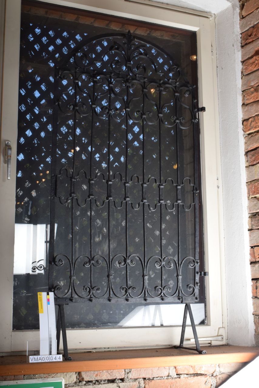 Barockgitter aus Schmiedeeisen, schwarz, von der Wolfgang-Kapelle in Kanning. Rechteckiger Rahmen mit halbrundem, eisernem Bogen, 8 Schmiedeisen-Felder und 3 Reihen Verzierungen, im oberen Bogen Eisenverzierungen