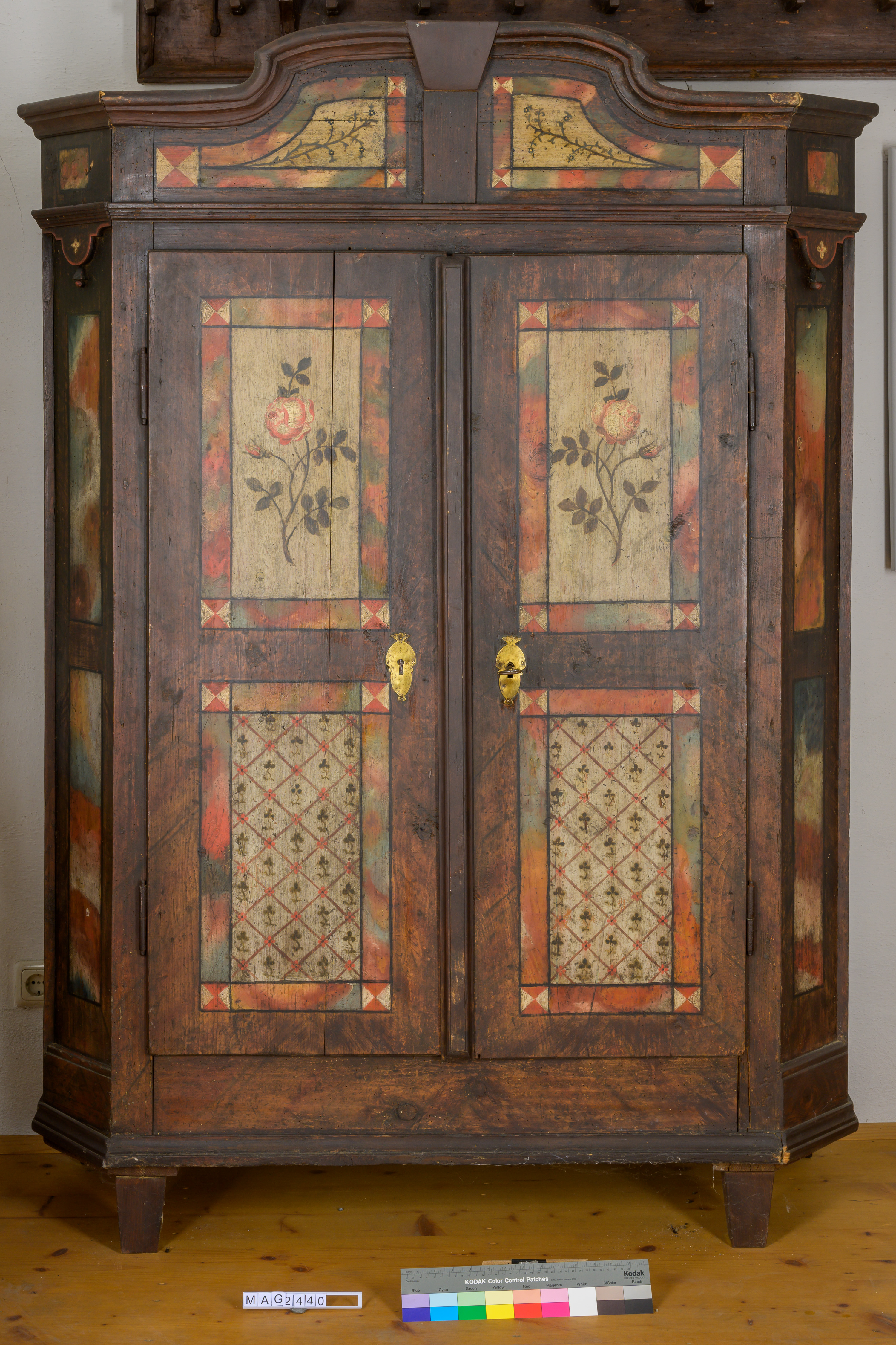 Bemalter Kasten, 1825 Ausführung: Johann Markl von Tautendorf, Tischlermeister in Oberplank Die bemalten "Bauernmöbel" gelten im allgemeinen Bewußtsein als Produkte des bäuerlichen Nebenwerwerbs oder Hobbykünstlertums. Tatsächlich handelt es sich aber - wie in diesem Fall durch die Signatur des Tischlermeisters eindeutig belegt - um Produkte des lokalen Gewerbes. Dies gilt wohl auch für die Malereien, die ursprünglich dazu dienten, auf den billigen Weichholzmöbeln die Intarsienmuster der herrschaftlichen Möbel zu imitieren bzw. zu ersetzen.siginert: "1825/ Johann Markl von Tautendorf/ Tischlermeister zu Oberplank"