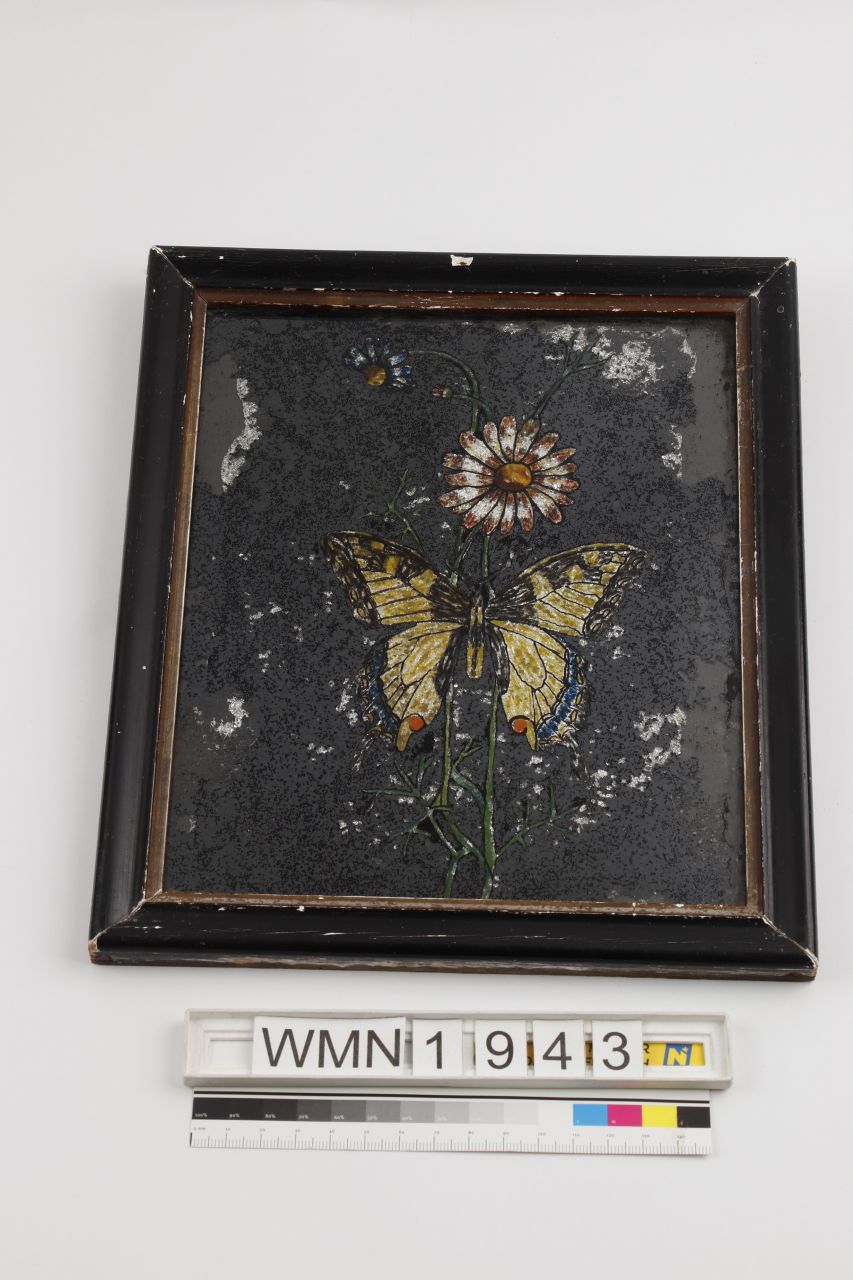 Ölgemälde, Gemälde; Portrait der Josefa Dietmayer; mehrfarbig; Darstellung der Josefa als Seniorin in schwarzer Kleidung mit goldener Brosche und goldenen Ohrringen; in Passepartout mit geometrischen Formen eingefasst; Bild unter Glas in braun gestrichenem Holzrahmen