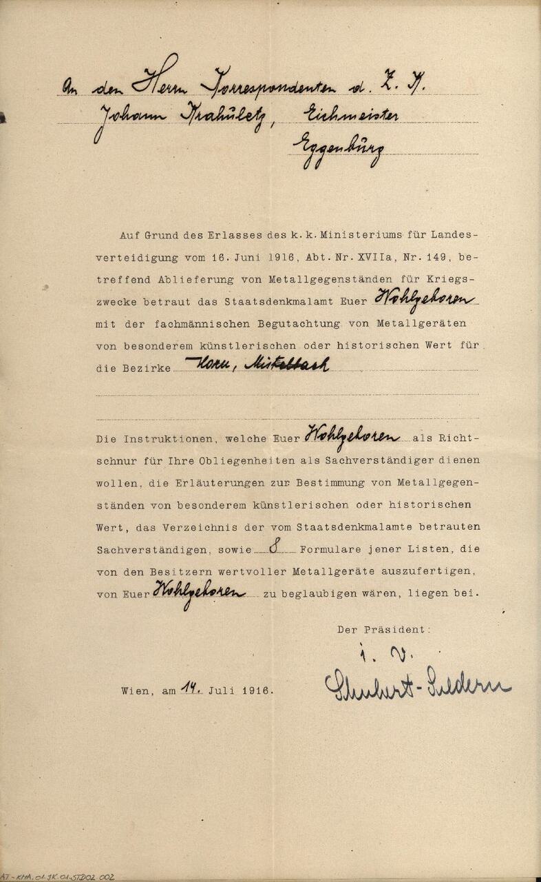 Das Staatsdenkmalamt betraut Johann Krahuletz mit der fachmännischen Begutachtung von Metallgeräten im Zuge der Ablieferung von Metallgegenständen für Kriegszwecke. [Beilangen nicht erhalten]