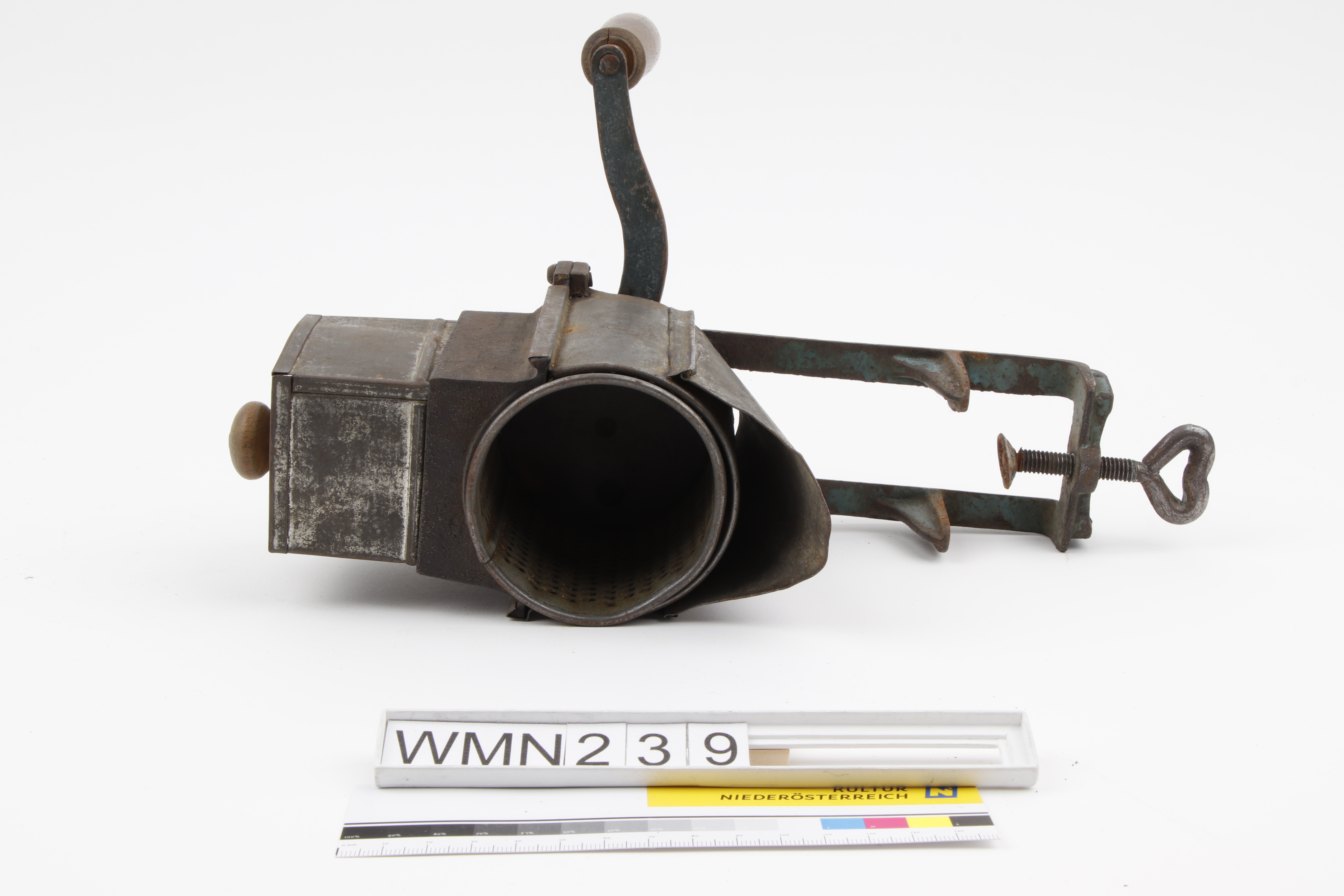 Handreibe (a); ehem. grün lackiert mit rechteckigem Aufsatz aus Eisenblech (b) und Holzschieber (c); Kurbel mit gedrechseltem Holzgriff und Schraubzwinge zur Befestigung am Tisch; gegossene Aufschrift an Trommelgehäuse "AUSTRIA NO 1/3" sowie Prägung "SCHUTZMARKE" und Darstellung von 3 Personen die eine Reibe betätigen