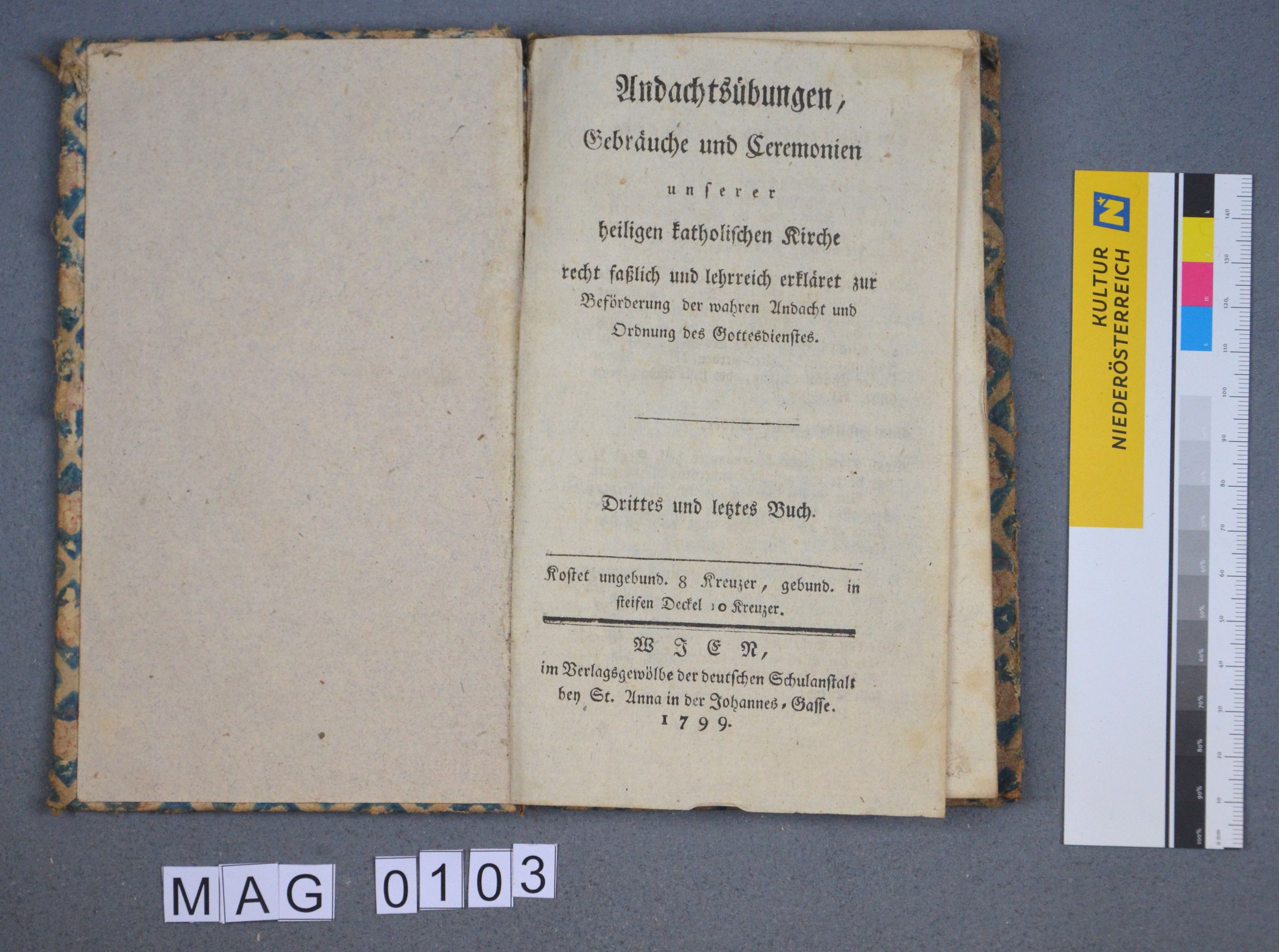JOSEPHINISCHE ABLEHNUNG DER GNADENBILDER "Andachtsübungen, Gebräuche und Ceremonien unserer heiligen katholischen Kirche recht sachlich und lehrreich erkläret zur Beförderung der wahren Andacht und Ordnung des Gottedienstes" Buchdruck mit gemusterten Papiereinband (Blumenmuster) , 87 Seiten, Wien 1799. Im Sinne der von Kaiser Joseph II. ab 1780 erlassenen aufklärerischen Maßnahmen gegen die barocke Religiosität wurde 1784 auch im Dekanat Altpölla ein Erlass bekanntgegeben, demzufolge alle Gnaden- und Votivbilder sowie deren Schmuck aus den Kirchen zu entfernen seien. Die vorliegende Schrift begründet diese Maßnahmen gegen den barocken Wunderglauben (u.a. durch Berührung und Opfergaben) unter Verweis auf Verordnungen der Kirchenväter und früher Synoden.