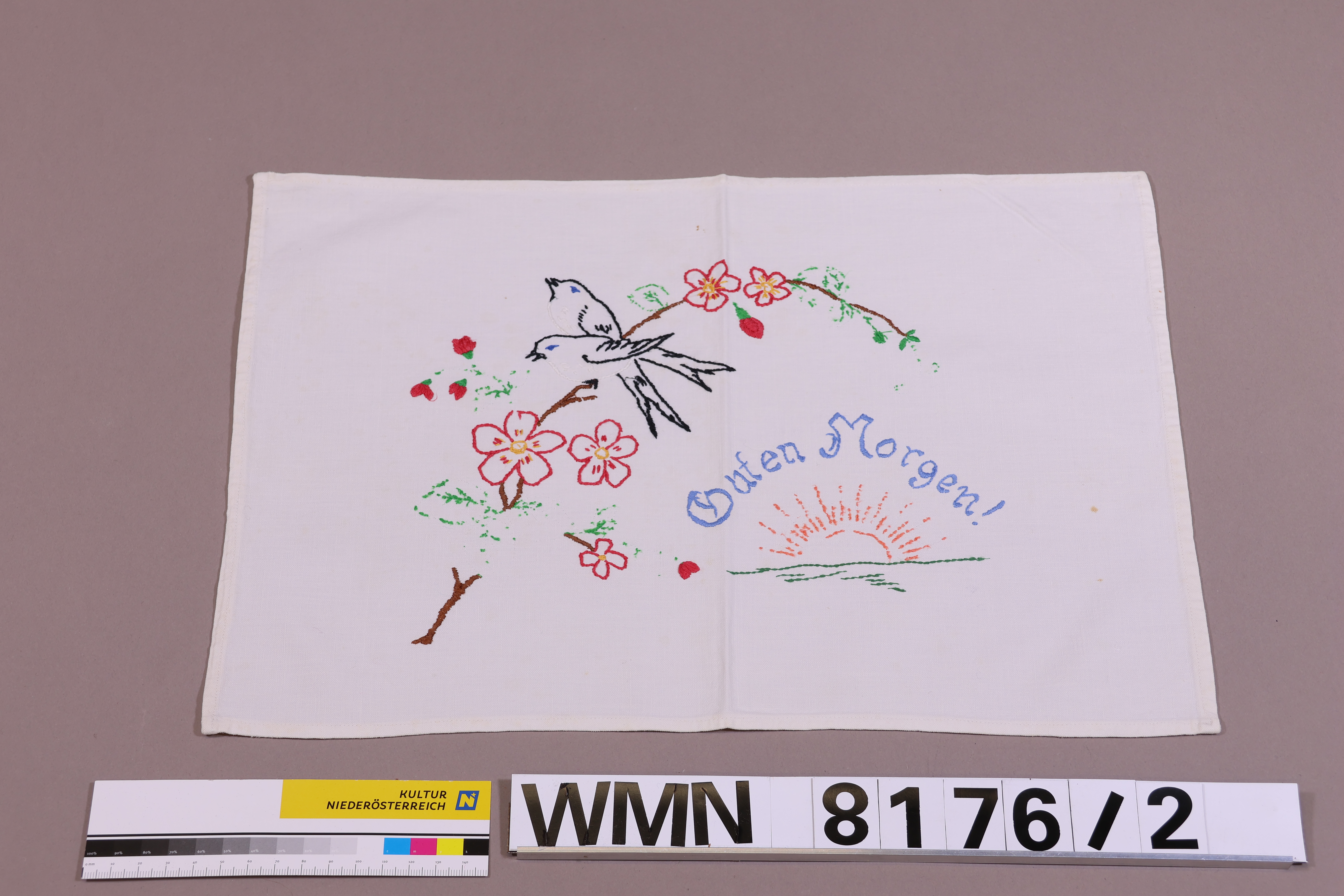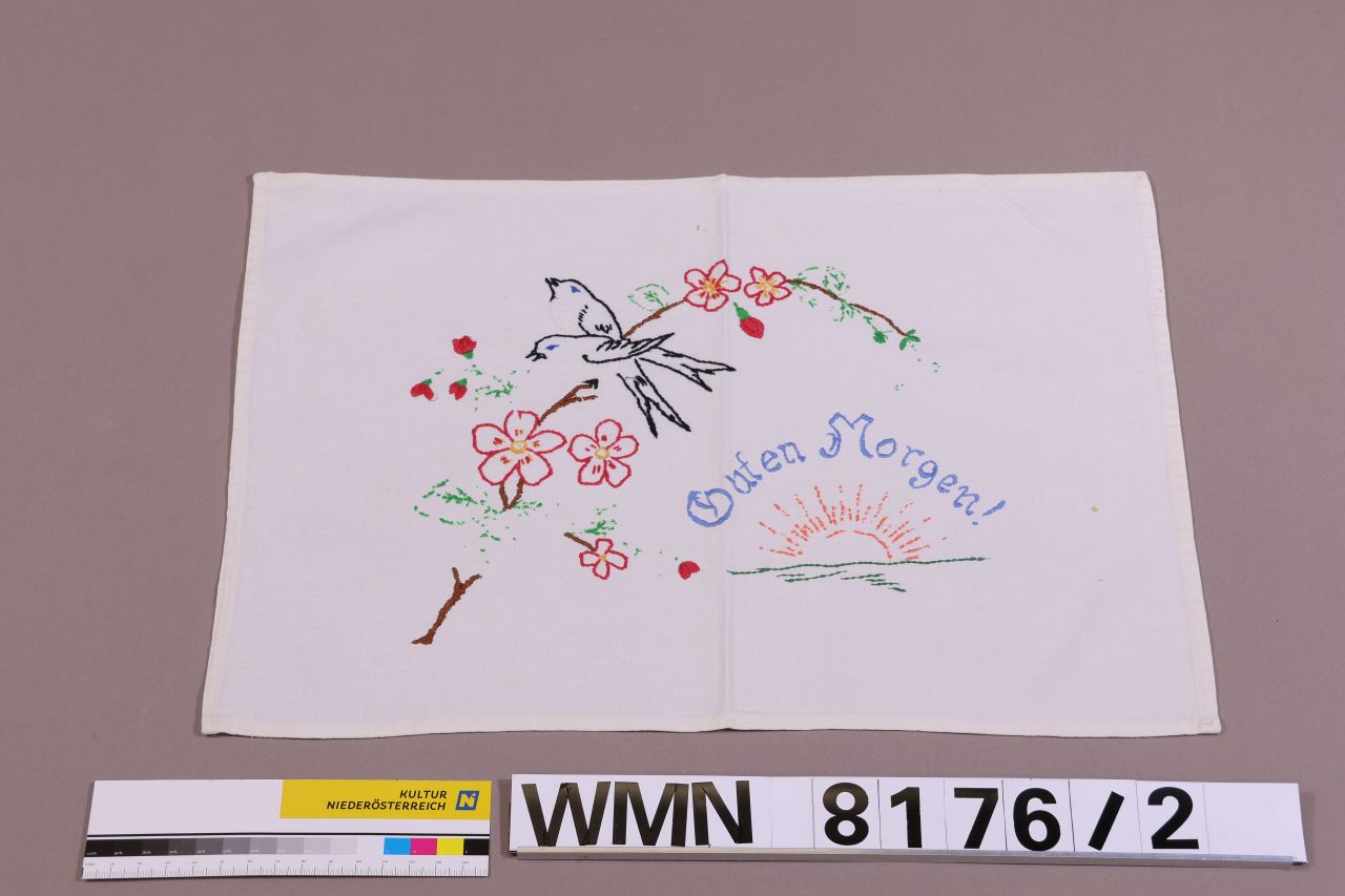 Deckchen, Zierdeckchen für Nachtkästchen / Nachtkastl; weiß; rechteckig; Stickerei mit Schriftzug: " Guten Morgen", florales, figurales Motiv; 2 Vögel auf einem Blütenzweig; Sonnenaufgang über einer flachen Landschaft (blau, rot, grün, gelb, braun, schwarz); abgesteppte Kanten