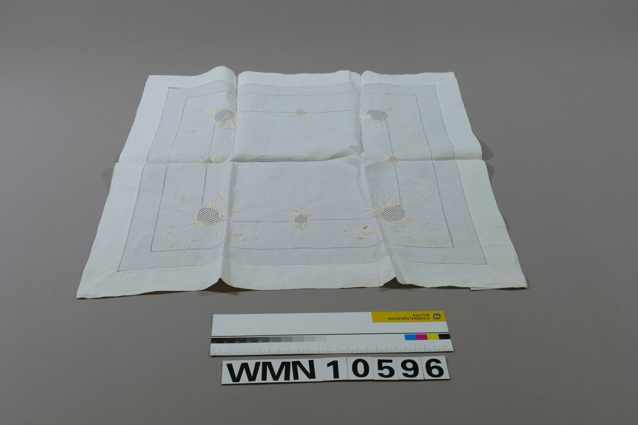 Deckchen, Tischdeckerl; weiß; annähernd quadratisch; stilisiert florale Durchbrucharbeit mit Hohlsaumrahmen und Häkelarbeit
