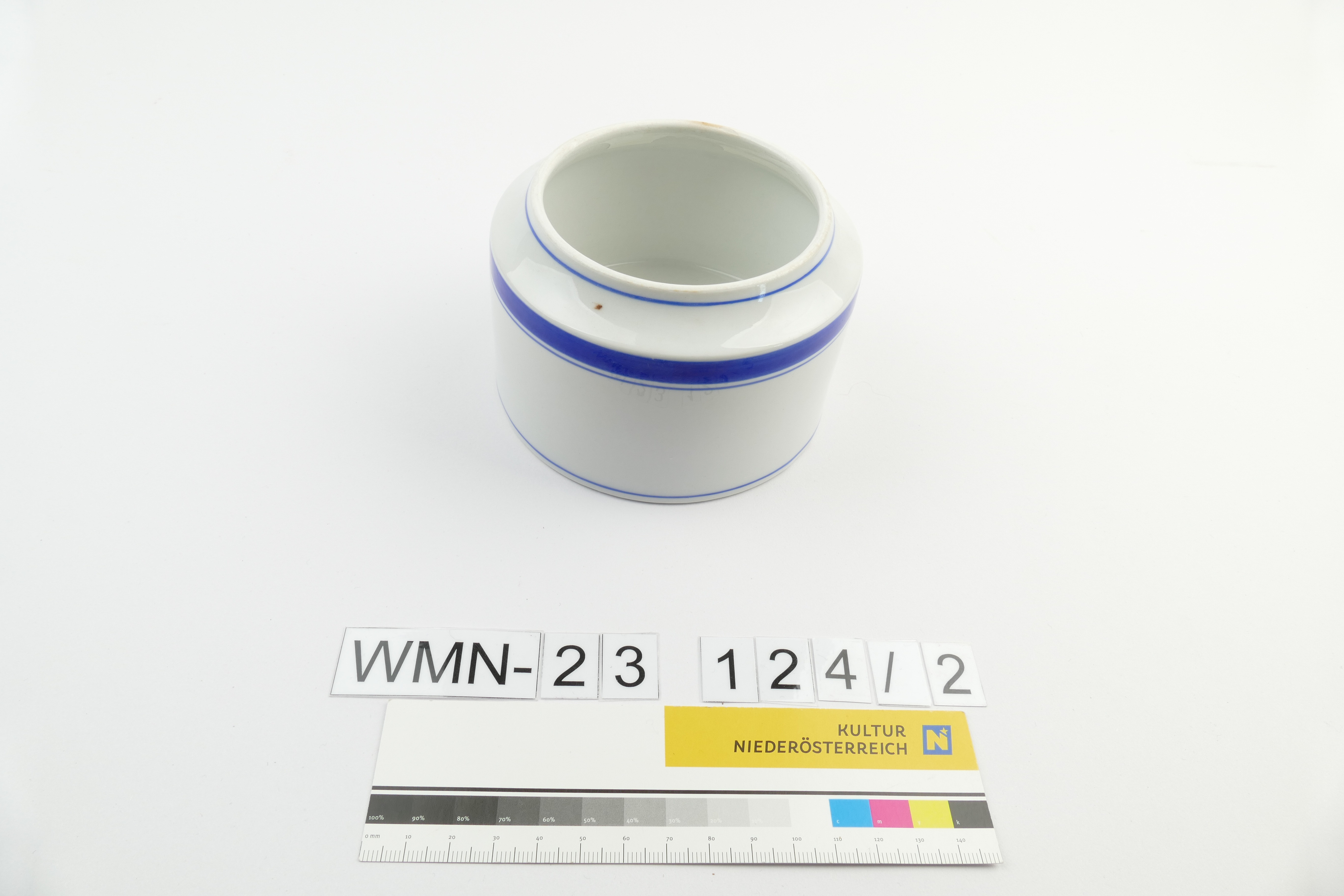 Zuckerdose eines Sets; außen/innen: weiß (glasiert); annähernd zylindrisch, mit nach obenhin verjüngender Öffnung für ehem. Dackel; 4 umlaufende, blaue Linien an der Wandung; am Boden Pressstempel [unl.]; blaue Glasurnummer "5i"