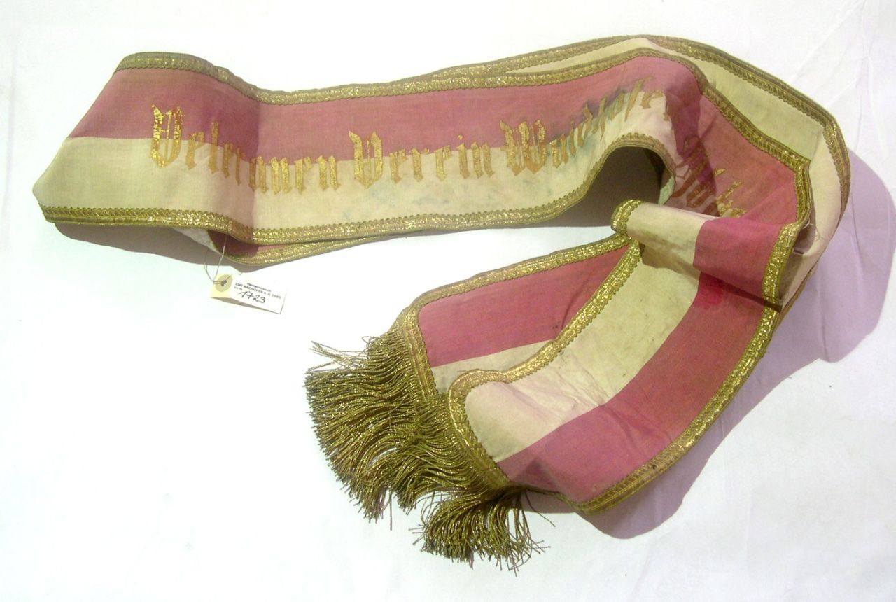 Fahnenband: rot-weiß, goldene Einfassung mit Aufdruck: "Veteranenverein Waidhofen a.d. Ybbs".