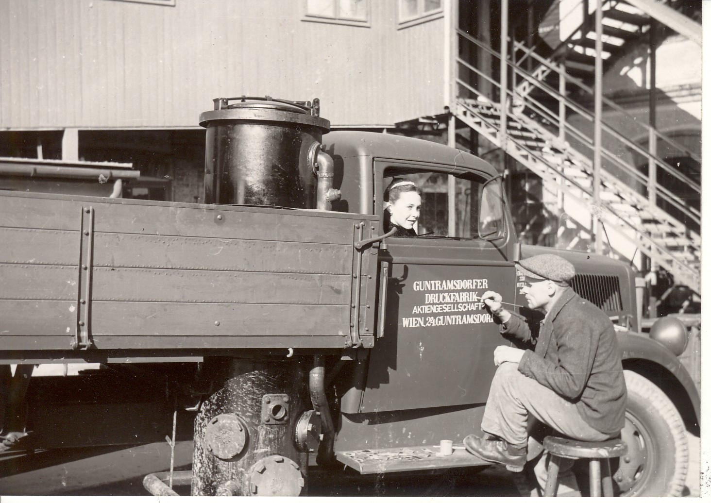 Außenaufnahme, Lieferwagen mit Holzgasgenerator der Guntramsdorfer Druckfabrik. Ein Mann beim Malen der Aufschrift auf der Beifahrertüre: "GUNTRAMSDORFER DRUCKFABRIK AKTIENGESELLSCHAFT WIEN, 24 GUNTRAMSDORF". Im Führerhaus sitzt ein Mädchen. Schwarzweißaufnahme, Fotopapier, Reproduktion. Rückseite mit Herstelleraufdruck: "Agfa" und Beschriftung: "Auto mit Holzgasgenerator um 1942 Negativ / Band 3 / Blatt 15 / Spalte 6/1 / Film Nr. 10".