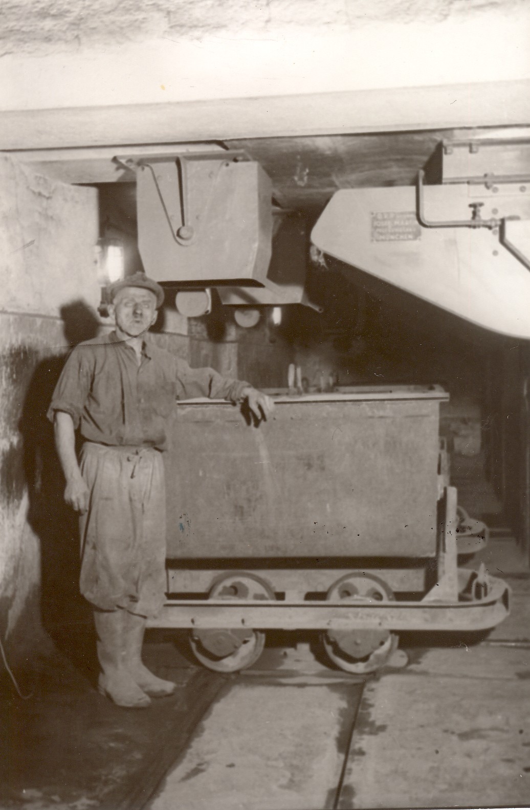 Innennaufnahme, ein Mann vor eine Lore im Kesselhaus der Guntramsdorfer Druckfabrik. Schwarzweißaufnahme, Fotopapier, Reproduktion. Rückseite mit Herstellerstempel: "RUDOLF WAWRA" und Beschriftung: "2730 Dr. F. im Kesselhaus".