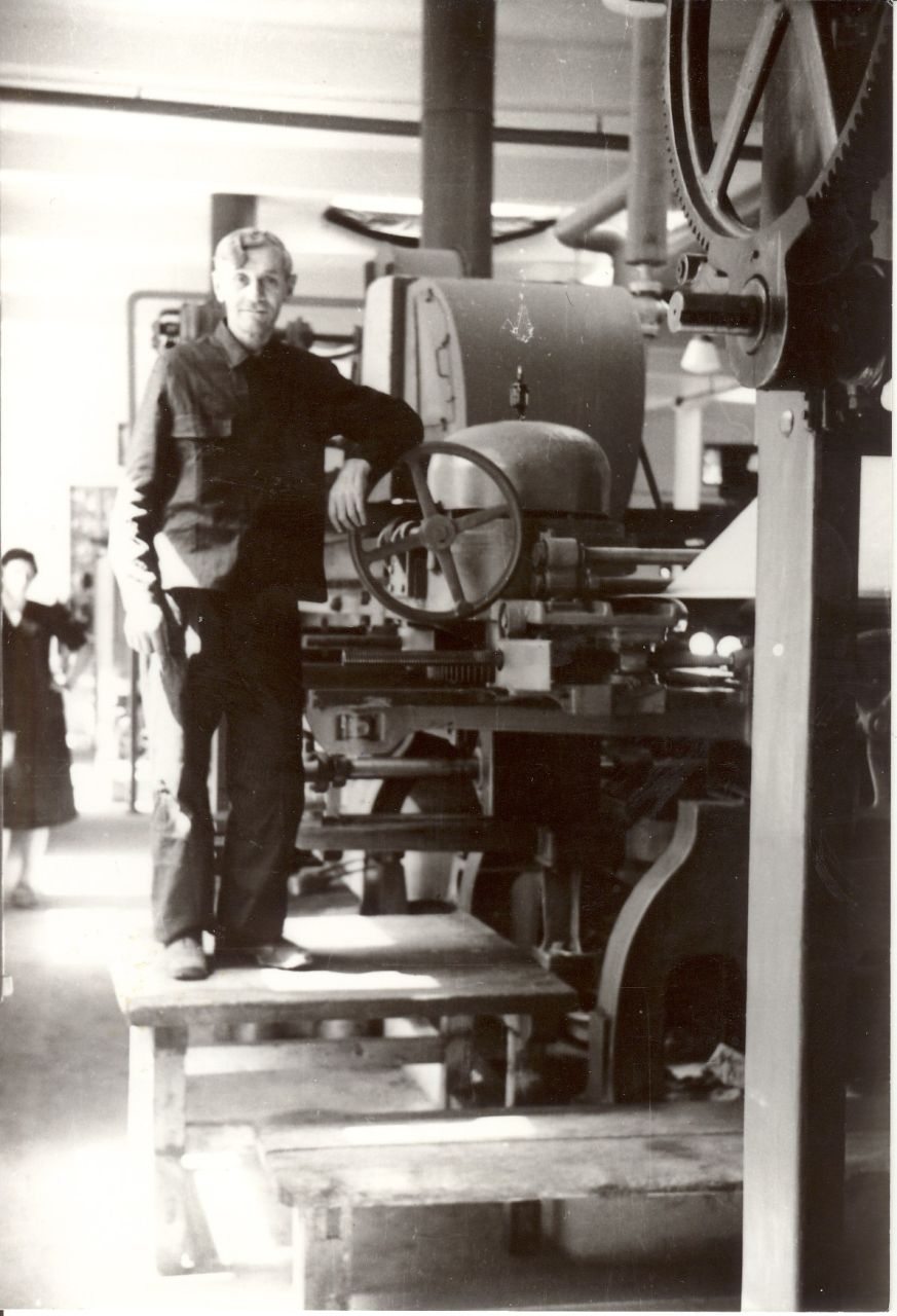 Innenaufnahme, ein Mann steht auf einem Podest an einer Maschine in der Bleicherei in der Guntramsdorfer Druckfabrik 1941. Im Hintergrund steht eine Frau. Schwarzweißaufnahme, Fotopapier, Reproduktion. Rückseite mit Herstellerstempel: "RUDOLF WAWRA" und Beschriftung: "Druckf. In der 'Bleicherei' 'Sängeri' 2375 1941".