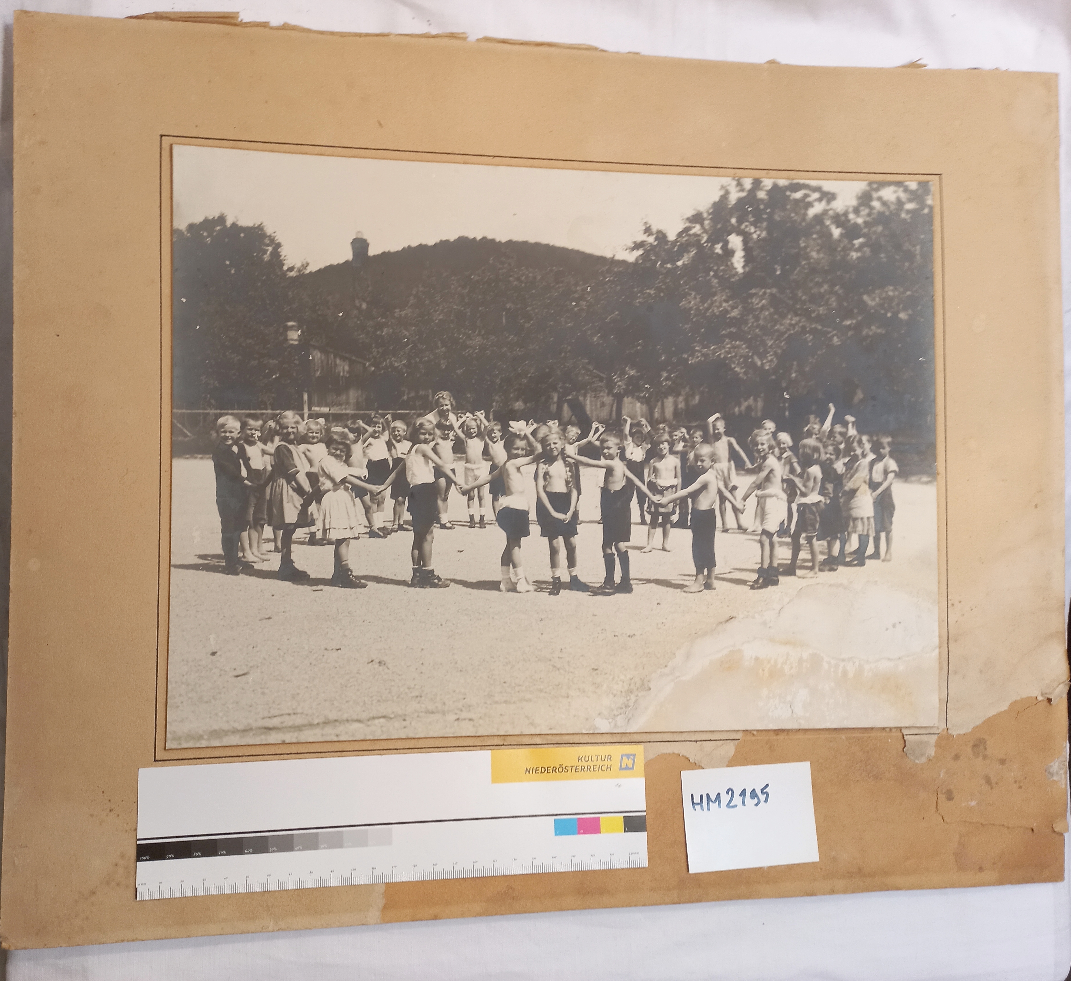 Schulkinder spielend im Kreis. Ort unbekannt, nicht Großgemeinde Ebreichsdorf. Auf Karton. Foto 40*29,3 cm