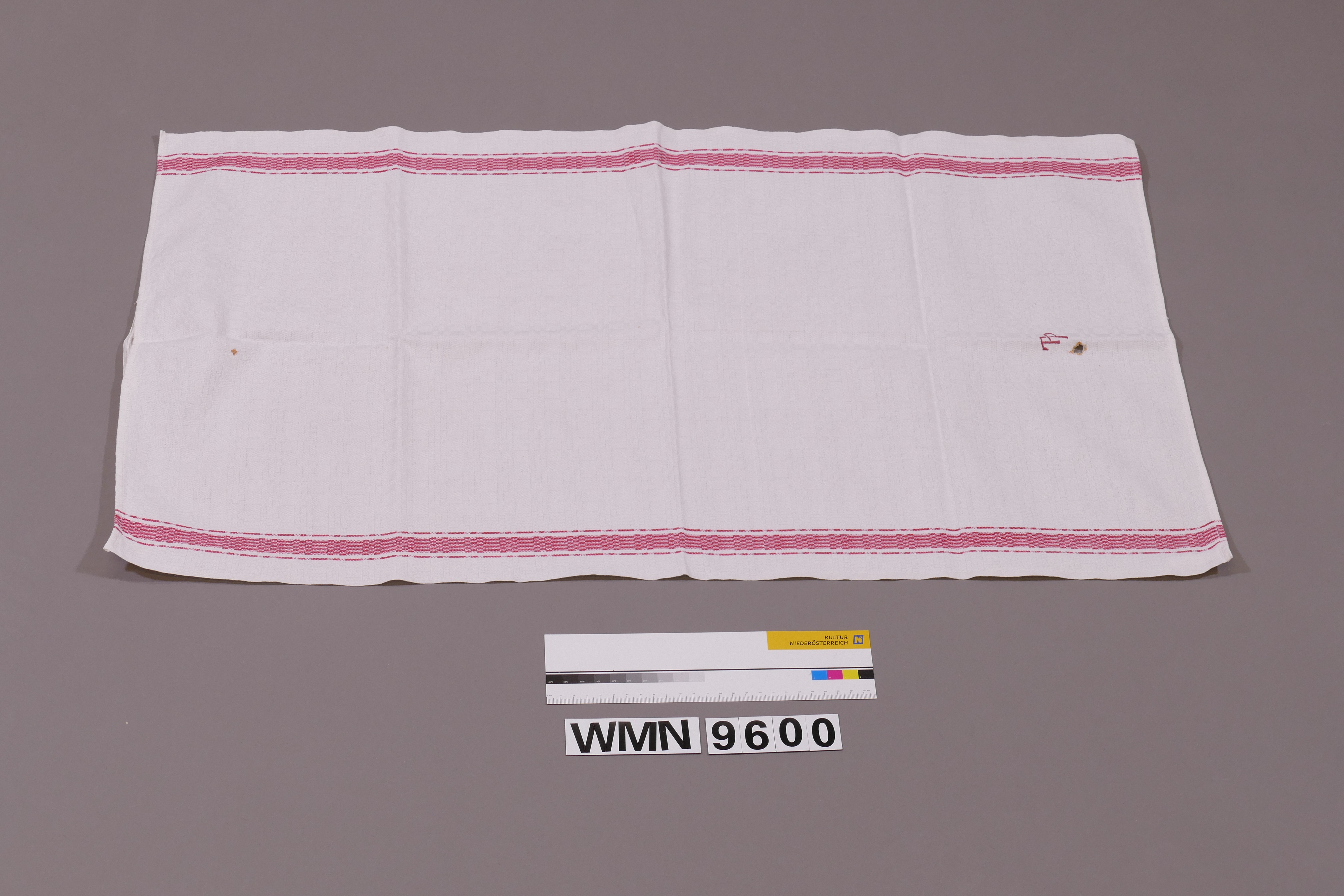 Hangerl; weiß; rechteckig; gewebtes Motiv (kariert und gestreift); an 2 langen Seiten: je 3 Streifen (rot); auf einer kurzen Seite: Monogramm "TP" (rot); auf einer anderen kurzen Seite: Aufhängevorrichtung in Form einer Lasche aus Köperband