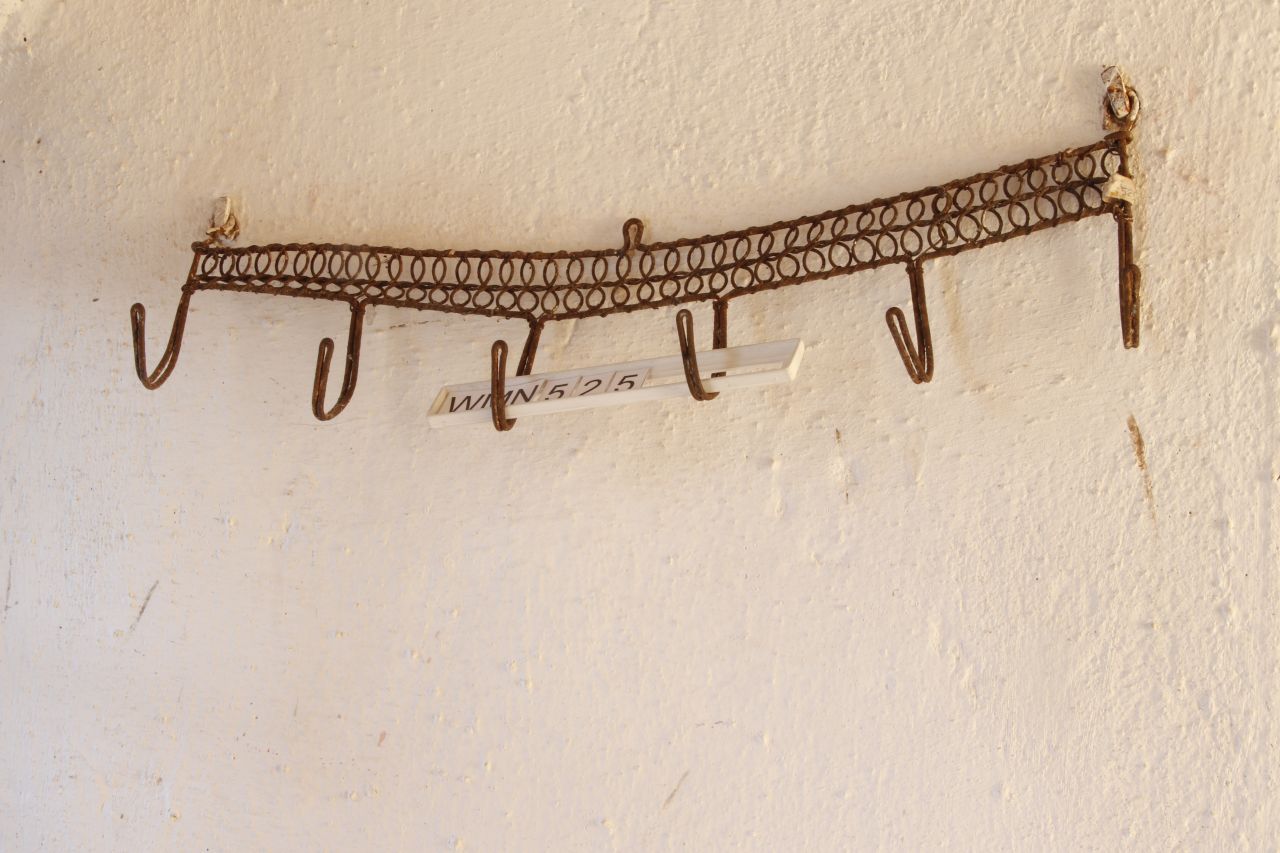 Garderoben; Garderobenleiste, Draht im Rahmen zu 6 Haken gebogen; an den langen Seiten ist der Draht zu einer kreisrunden Aufhängung gebogen; li und re je eine Drahtaufhängung