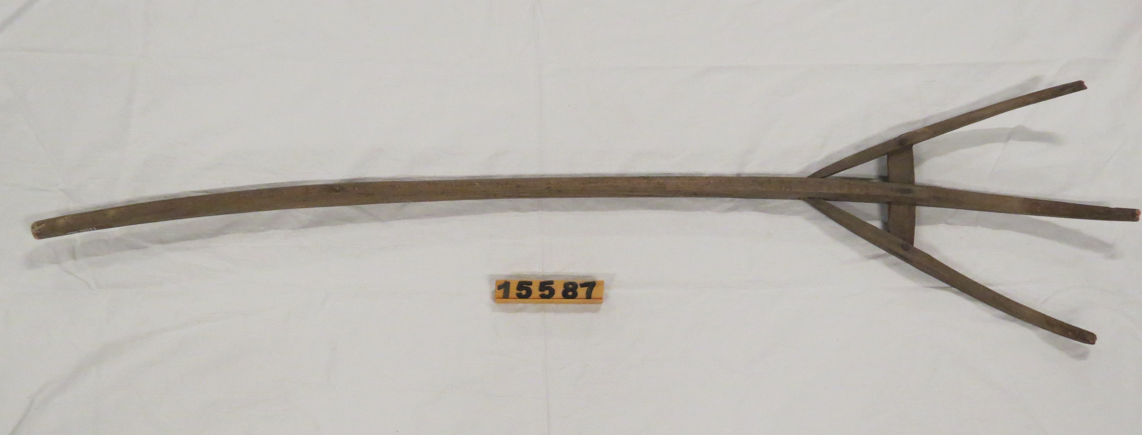 Heugabel aus Holz, mit 3 Zinken und 1 Querverbindung, abgerundeter Stiel läuft in den mittleren Zinken über. Die Zinken sind mit Eisennägeln am Querbalken fixiert. 2 der Zinken sind am unteren Ende mit Eisennägeln beschlagen. Am unteren Ende des Stiels befindet sich links, rechts und mittig jeweils die Prägung "J S".