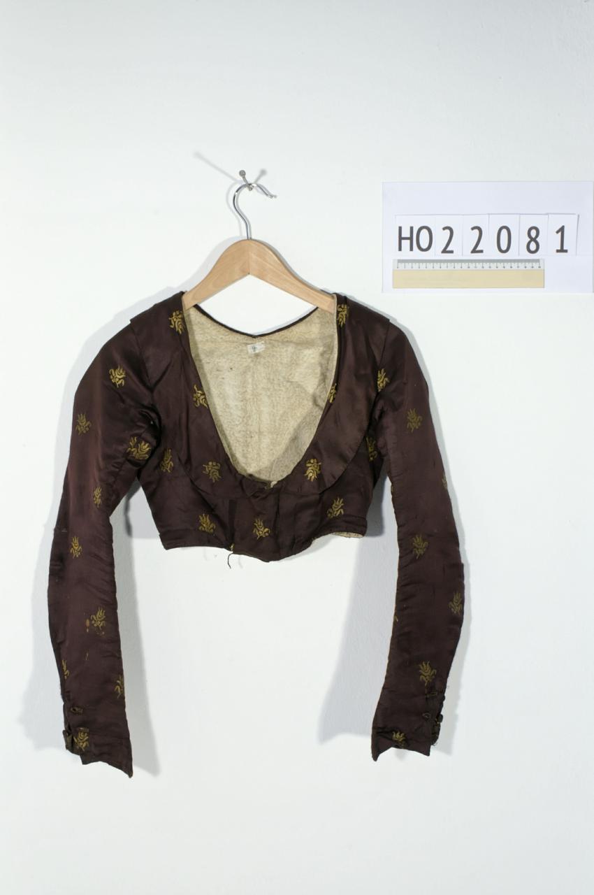 Damenjacke, vermutlich Spencer, violett mit goldenen Blumen, gefüttert