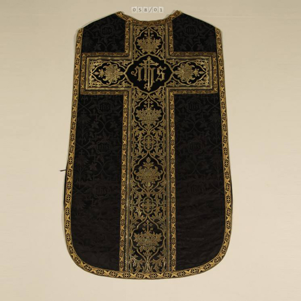 Kasel aus schwarzem Damast, Rankenmuster mit Nomen Sacrum-Motiven, Stab aus Goldbrokat, Rückseite: Kreuz mit Nomen Sacrum, schwarz-goldfarbene Borten; schwarzes Futter