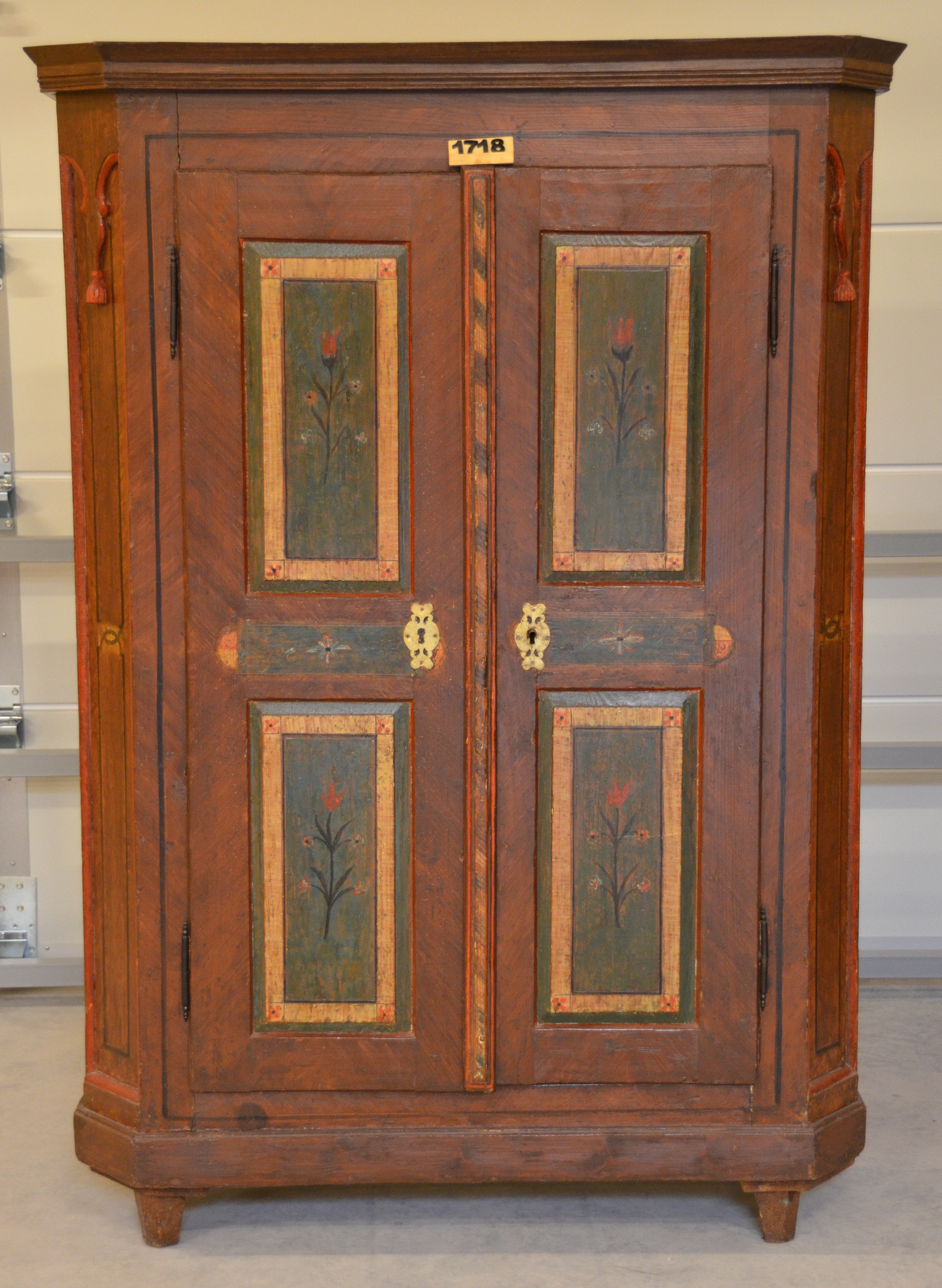 brauner, zweitüriger Kasten, in den Türen je zwei Füllungen mit blau/grüner Grundierung, Blumendekor und beigfarbener Umrandung; abgeschrägte Seitenteile mit geschnitzten Quasten; Türschloss mit Messingschlossbeschlägen