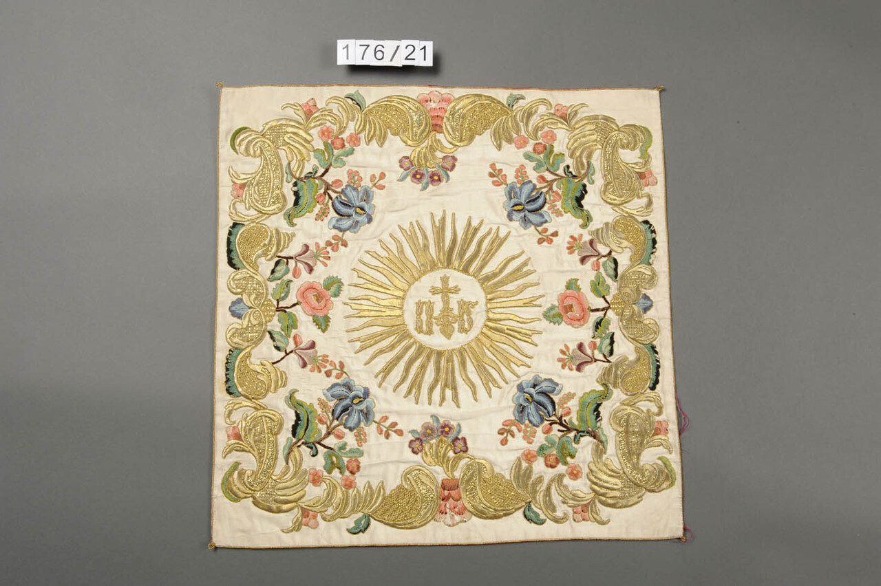 Blumenmuster (rosa, violett, blau) in Spreng- und Anlegetechnik, Konvolut: Weißer Ornat, 9546/176