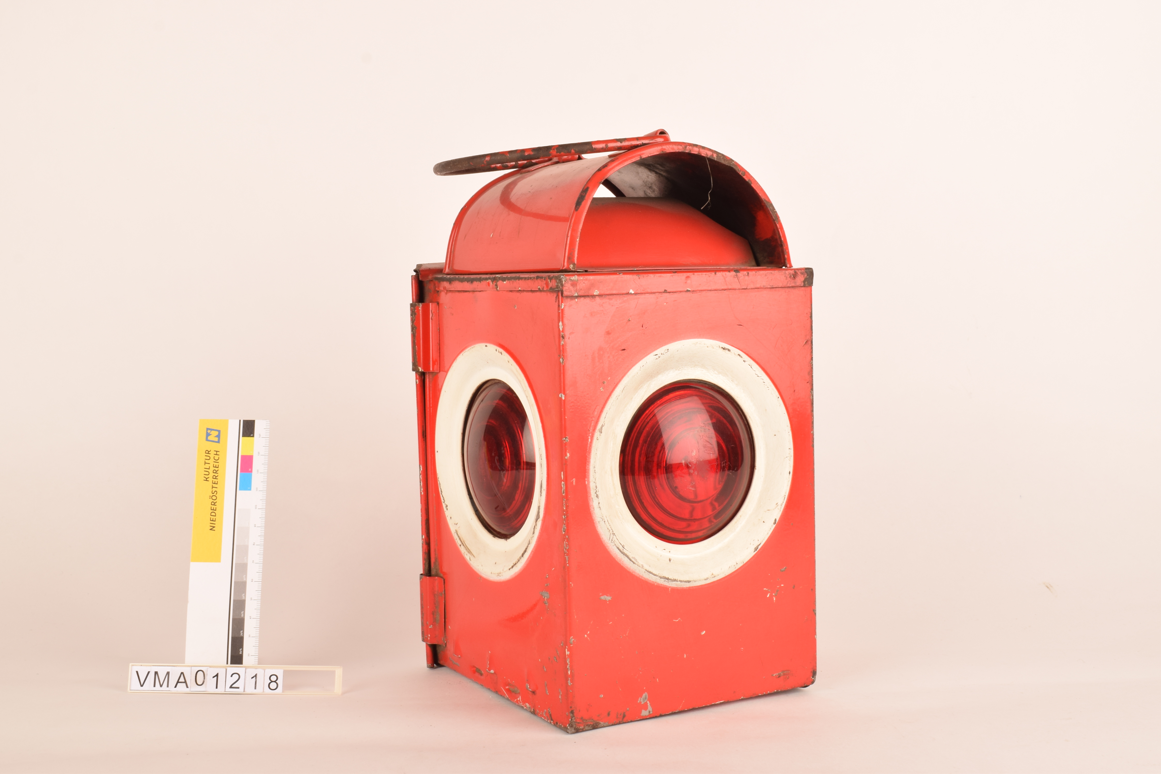 Rot, mit rotem weißumrandetem Bullauge; links Türchen zum Öffnen, am Deckel rundes aufgesetztes Eisenteil und Vorrichtung zum Befestigen eines Henkels