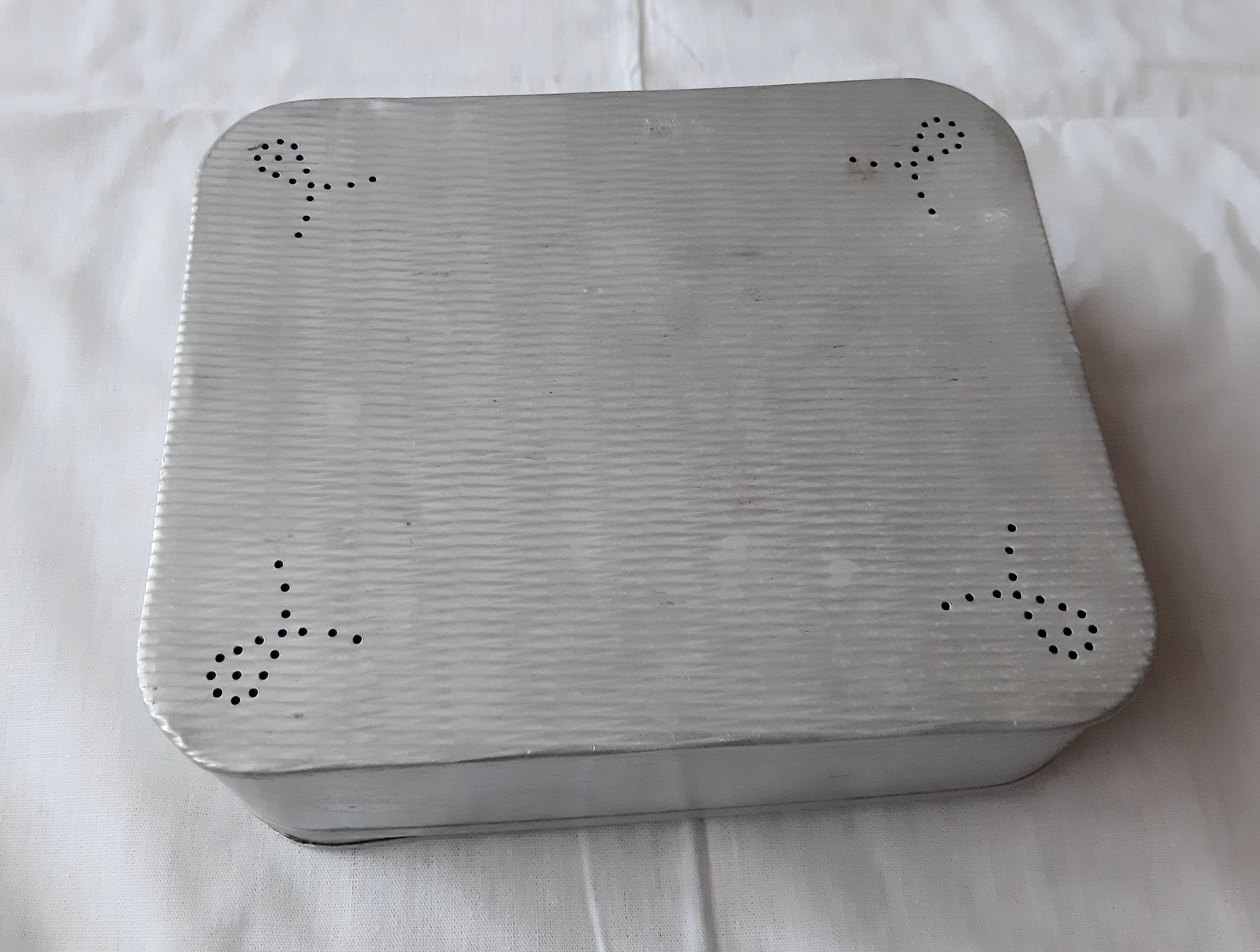 Lebensmittel-/Jausendose Aluminium, Silbergrau Proviantdose an Deckel, abgerundete Schleifenartige Luftlöcher 2. Weltkrieg Oberfläche oben+ unten geriffelt. 23x19x8cm