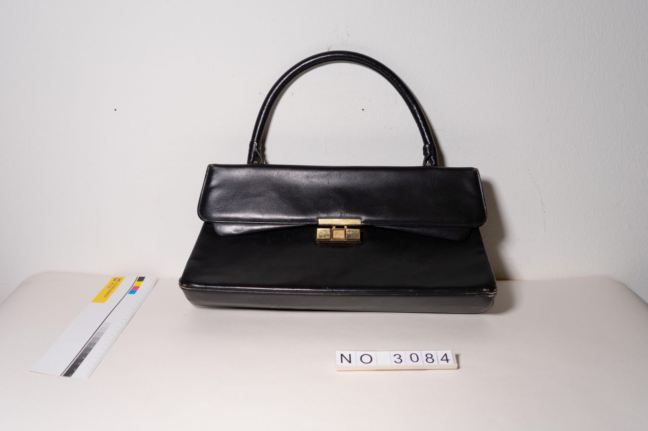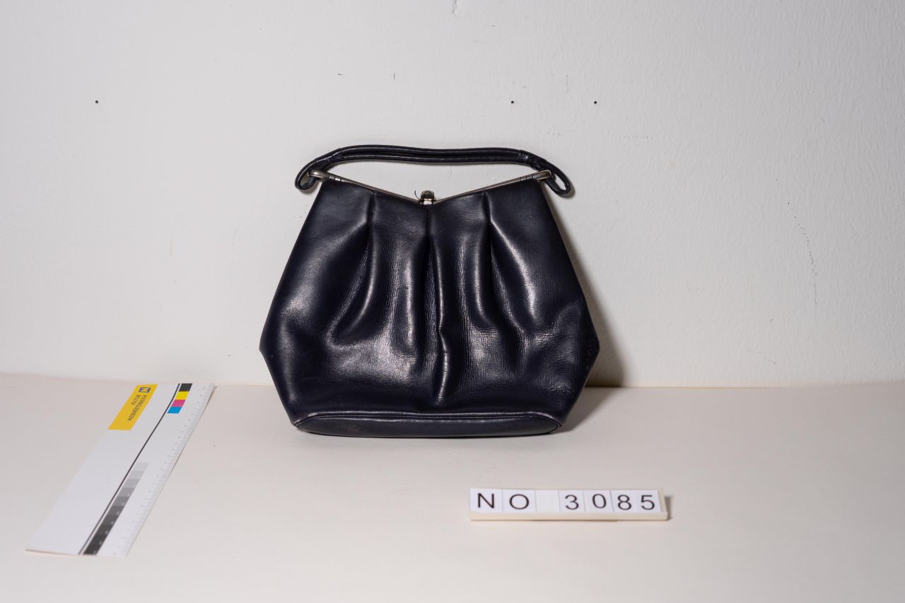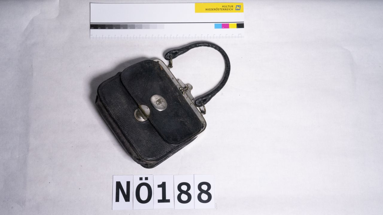 Kleine Lederhandtasche mit Metallbeschlag und Ledergriff. Handzettel in Tasche gefunden: "Leni Walter, datierte Handtasche mit Schlüssel. 15/11 1899. Am Innenbügel F Schleuchers Wien." Mit Verschluss, ohne Schlüssel. Vorbesitzerin: Leni Walter, Leder, versilbertes Messingemblem mit Gravur "L W" "15/11.1899"