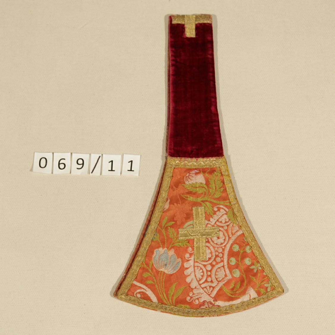 Manipel aus rotem Samt, Schaufeln aus hellrotem französischen Seidenbrokat, florale Ornamentik in Weiß, Grün und Blau, Goldborten an der Schaufel; rotes Futter