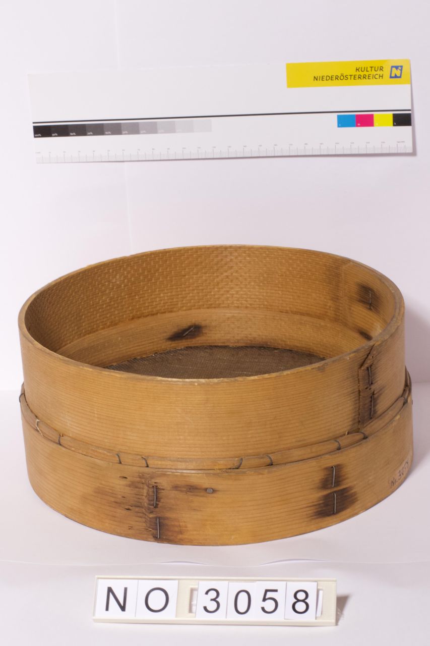 Mehlsieb mit Holzrahmen und Metallgitter zum Feinsieben des Mehls.