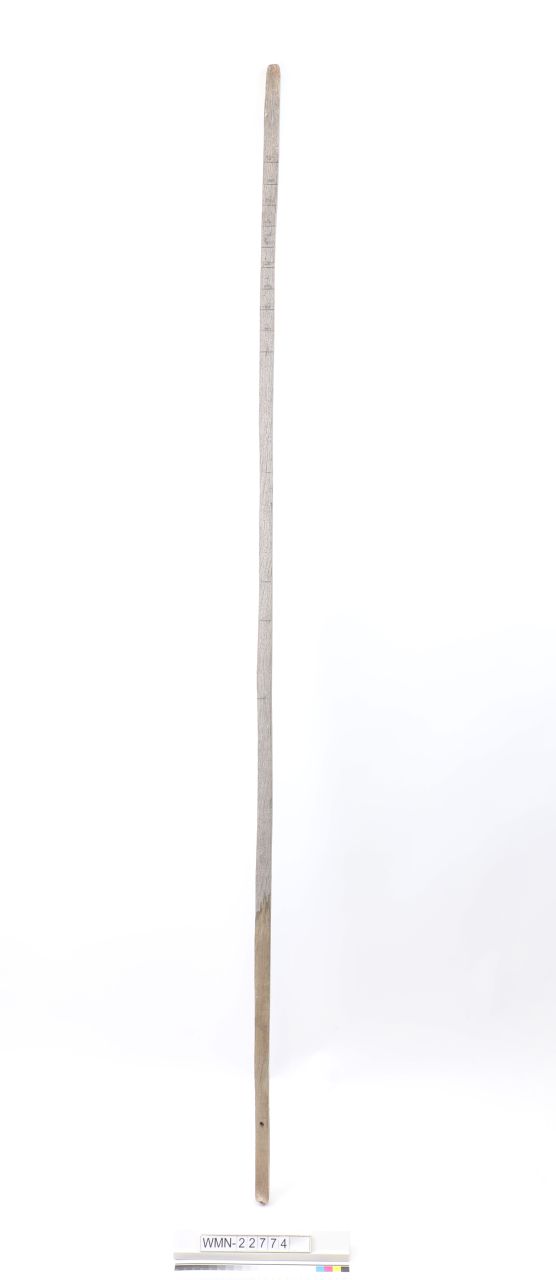 annähernd quadratischer Holzstab mit diversen Bleistiftmarkierungen (Zahlen von 1 bis 9) neben eingeritzten Linien; einseitig deutlich abzeichnende Feuchtespuren (Lagerungsbedingt)