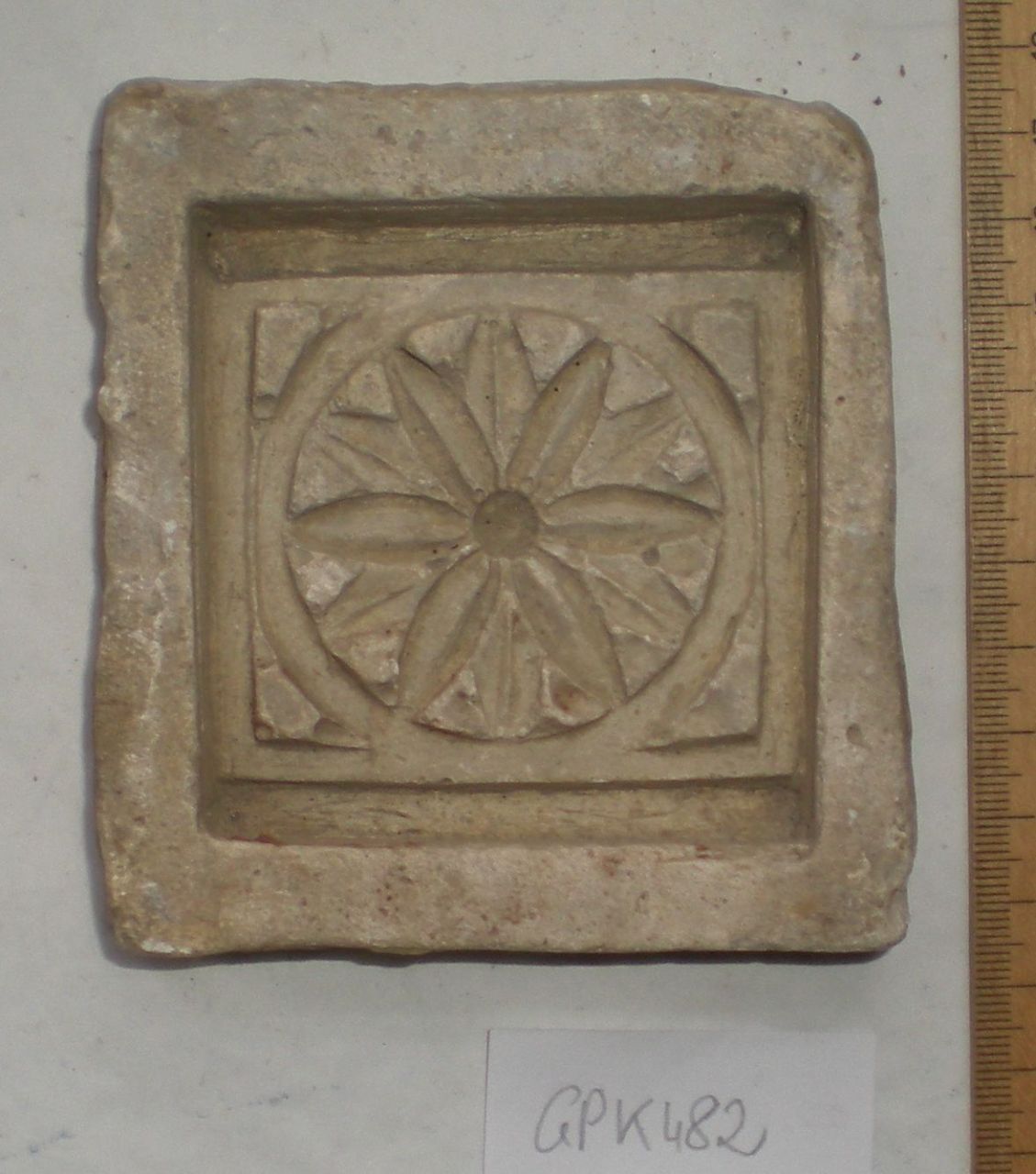 Model einer Blütenrosette in quadratischem Feld, auf der Rückseite die Ritzung "Joseph / Iz...r / 1853"- Ofenkeramik