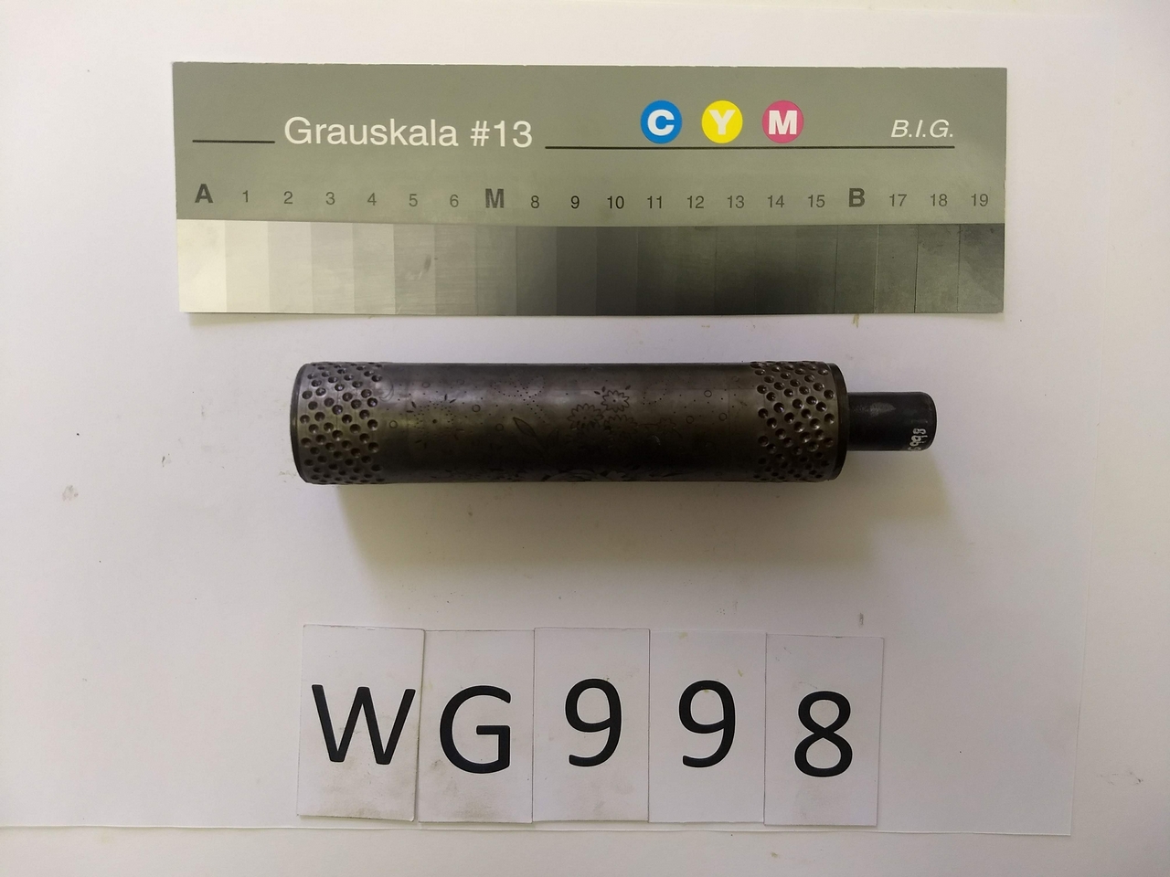 zylindrische Muttermolette; rechts verjüngt weiter gearbeiteter Fortsatz (Lagerzapfen) mit einer flach gearbeiteten Stelle; an den Deckflächen jeweils ein Loch; Mantel rechts und links mit vertieften regelmäßig angeordneten Punkten, im Zentrum vertieftes stilisiert florales Muster (weit geöffnete Blüte im Zentrum, dazu kleinere Blüten und Blätter drumrum, Astwerk aus Punktlinien)