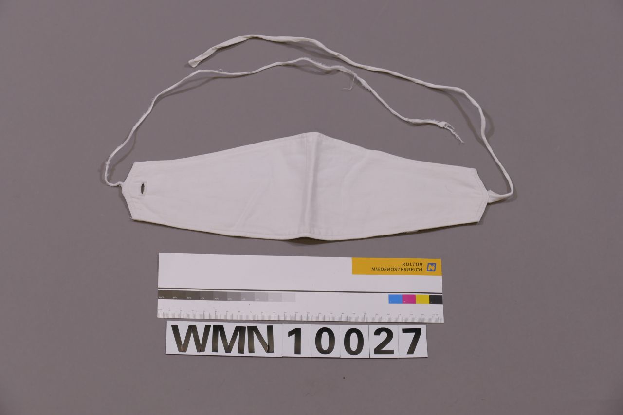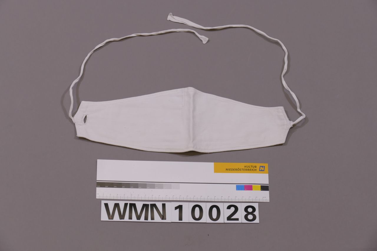weiß; rautenförmig; an zwei Seiten: je ein Band; an einer Seite: handgeschürztes Knopfloch zum Durchziehen
