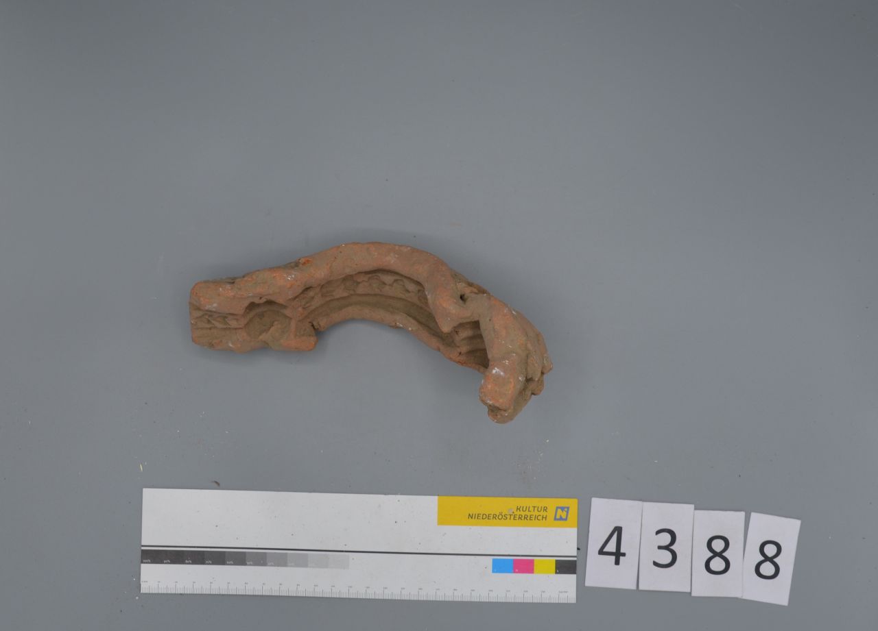 gebogene Negativform mit Musterband mit kleinen aneinandergereihten Lilienmotiven; (vermutlich für Stuckarbeiten);