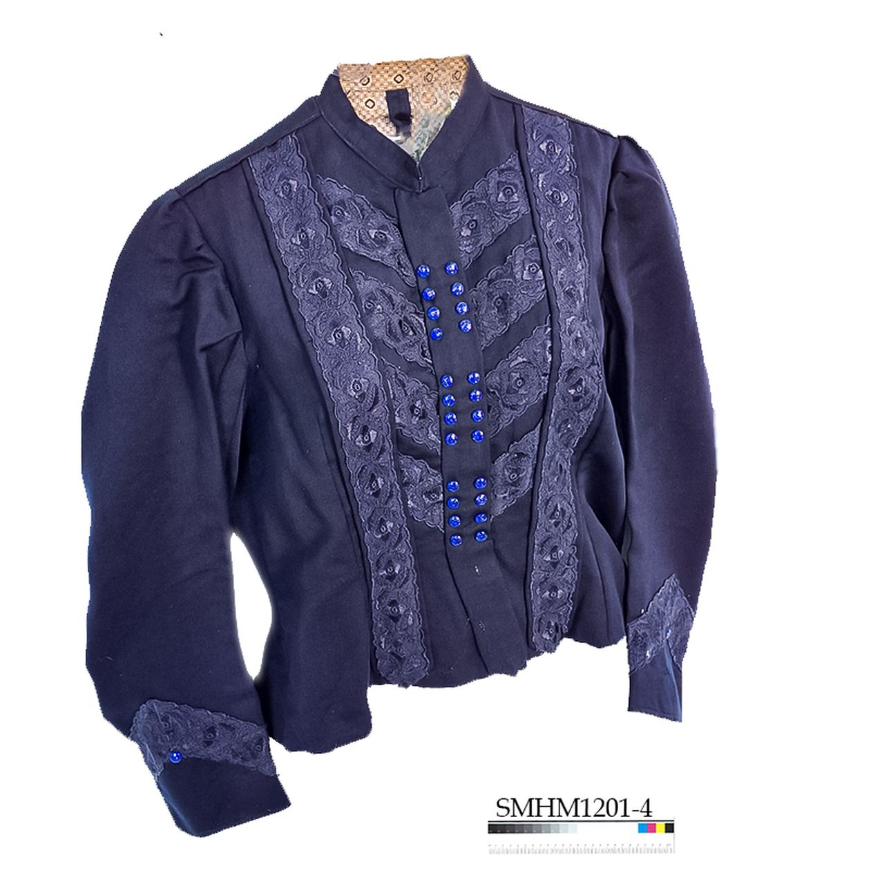 Spenzer; schwarz; genäht, applizierte Spitze an den Ärmelenden und am Oberteil; Samt; Oberteil durch 5 mit Samt bezogene Knöpfe verschlossen; Leib in großen Falten gerafft / tailliert
