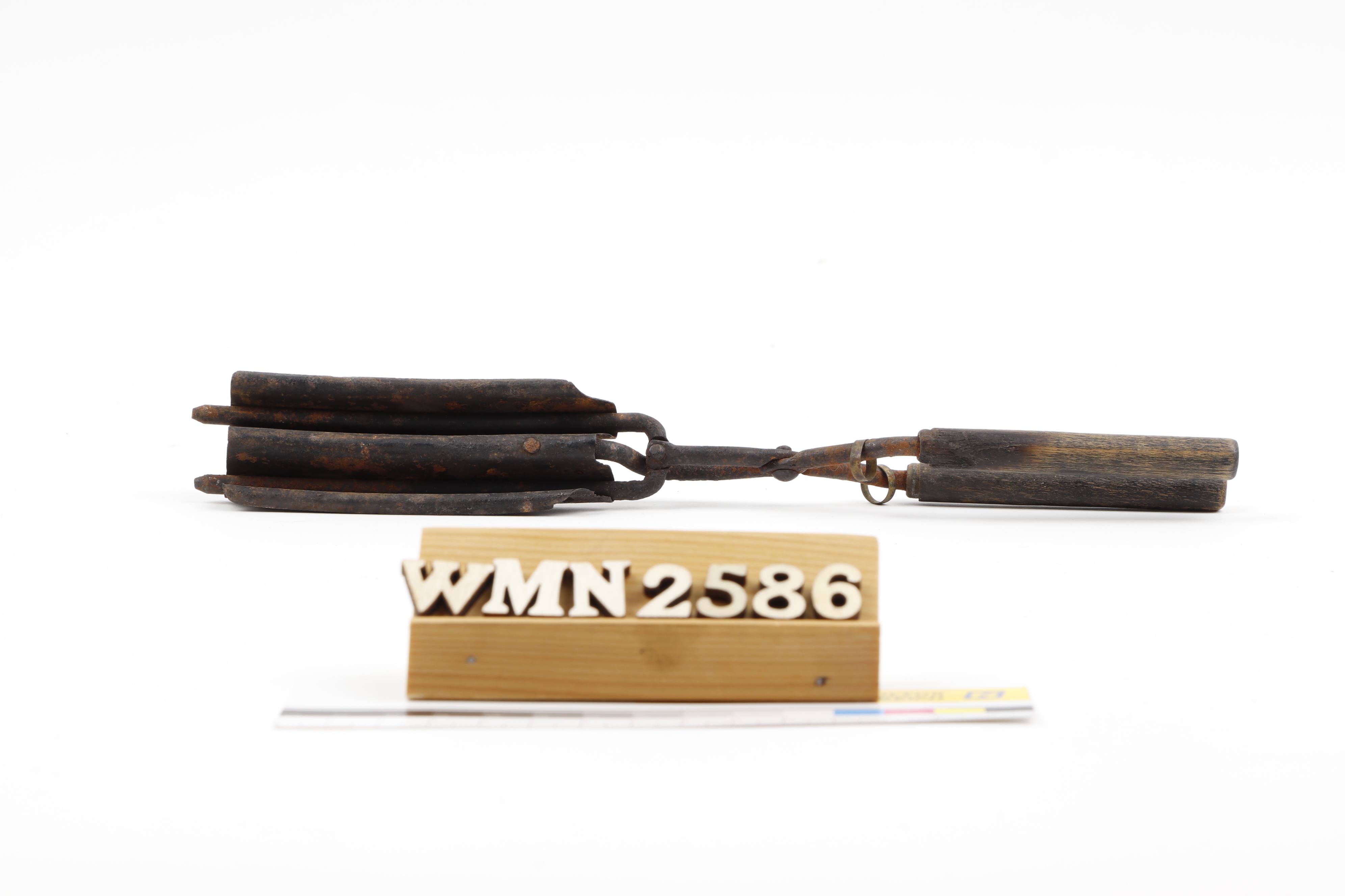 Brennschere, Lockenschere mit zwei schwarzen, gedrechselten Griffen mit je einem Messingring verstärkt; an einem Griff befindet sich ein rechteckiges, gewelltes Stück Metall und am anderen Griff 2 Eisenrundstäbe