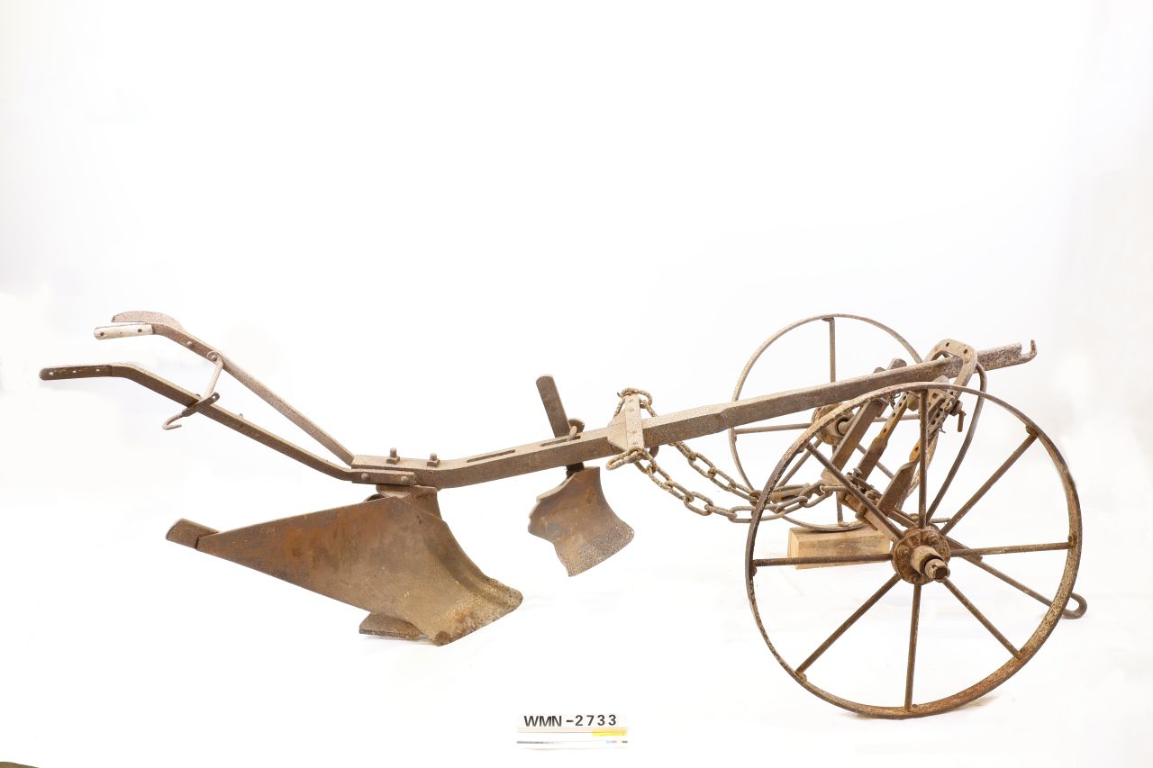 Karrenpflug für Tiefkultur; Untergrundkrümler mit Vorgestell; Rigolpflug (a) mit Karren (b); Grindel, Sterzen, Pflugkörper und Karren aus Eisen; gerader Grindel mit 2 angeschraubten Sterzen, 1 von ehemals 2 Schalengriffen aus Holz als Handhabe, links 1 Abweiser, rechts ein Werkzeughaken, 1 Querstrebe; sehr schwerer Pflugkörper, einseitige Schar mit stark gebogenem langen Streichblech, rechtswendend; davor ein breiter Vorschäler, im hinteren Bereich abgebrochen; mittig am Grindel 1 Selbstführungsquerbalken mit 3 Haken zum Einhängen des Vorgestells; rückseitig an der Schar eine mitgegossene Typen- und Herstellerangabe: "R14M WS Clayton & Shuttleworth"; rückseitig am Streichblech ein rundes Herstellerembleme von Clayton & Shuttleworth, mehrfarbig, aufgepresst; Vorgestell (b): 2 Speichenräder mit Stellrahmen; höhenverstellbares kleines Rad; 2 Eisenbacken zum Stabilisieren der Grindelstange; Gestellbogen mit sicherbaren Steckbolzen; Zughaken für die Gespannnutzung; Aufschrift an den Rädern: umlaufend mitgegossen "S R 5" (a) L 220 cm, B 90 cm, H 130 cm (b) L 130 cm, B 86 cm, H 89 cm