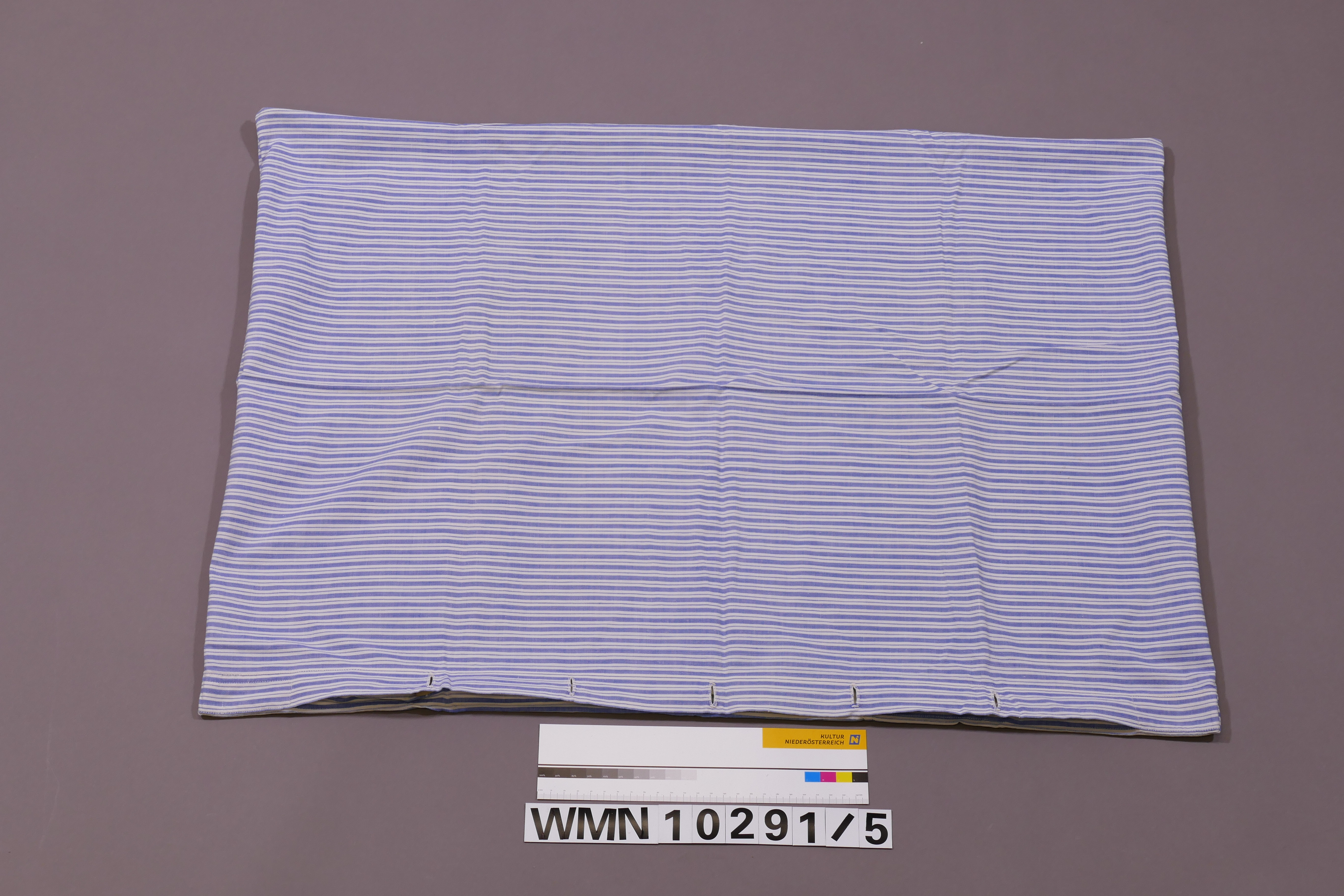 Polsterüberzug, Überzug; blau-weiß gestreift; rechteckig; 5 handgeschürzte Knopflöcher, 5 Kunststoffknöpfe