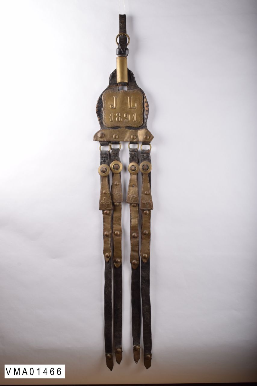 Prahlriemen aus Leder für Pferde - 4 Riemen mit Messingbeschläge und getriebene Messingplatte: "J.L. 1891"