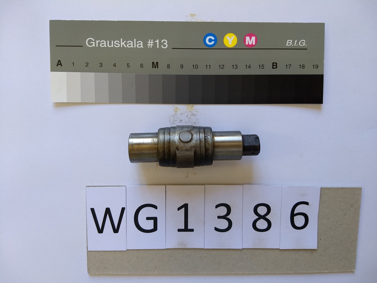zylindrische Reliefmolette; rechts und links verjüngt weiter gearbeitete Fortsätze (Lagerzapfen); rechter Lagerzapfen länger mit acht vertieften Punkten und einer vertieften Linie; an den Deckflächen jeweils ein Loch; Mantel mit einem erhabenen Kreis mit gestrichelter Oberfläche