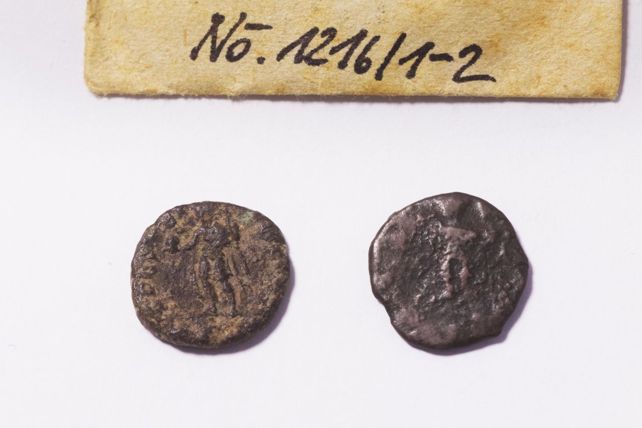 Römische Münze. Laut Beschreibung: "Julian 361-363 Centenionalis RV Spes Reipublice" Avers Abbildung Kaiserportrait. Revers Abbildung Soldat mit Standarte, Umhang und Globus in der Hand. Aufgrund Abbildung eventuell eher ein Follis.