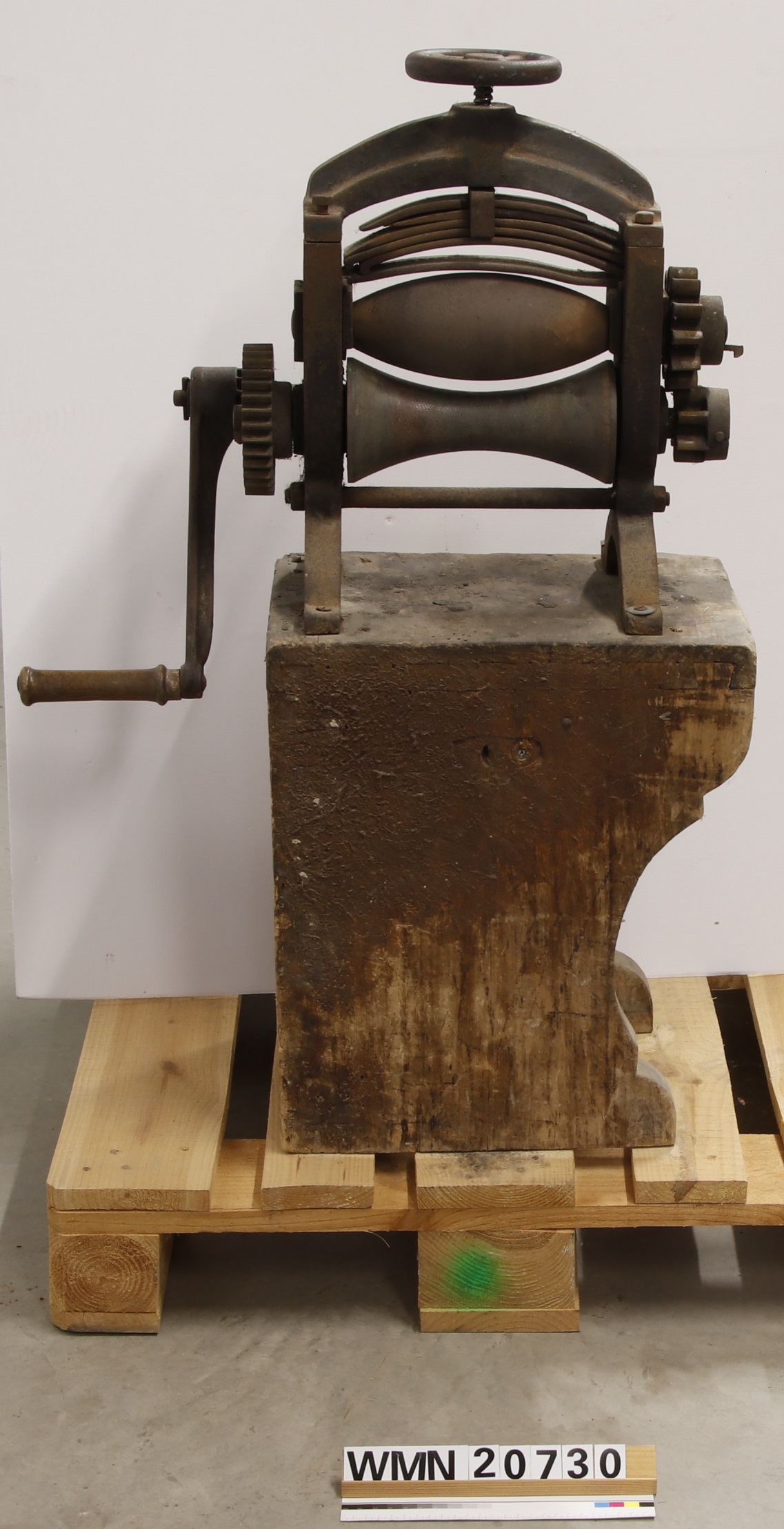 Sohlen-Rundwalze, Walze; Eisengestellt mit 4 Standfüßen und 2 Walzen und mehreren Eisenstäben und Zahnrädern; über den Walzen ein Kurbelrad und seitlich eine Kurbel mit Holzgriff; am Korpus eine gegossene erhabene Aufschrift: "Th. Lempperan Stuttgart [?] gesetzlich geschützt" sowie eine Prägung: "13"; auf braunem Holztisch mit 2 geschwungenen Seitenteilen montiert