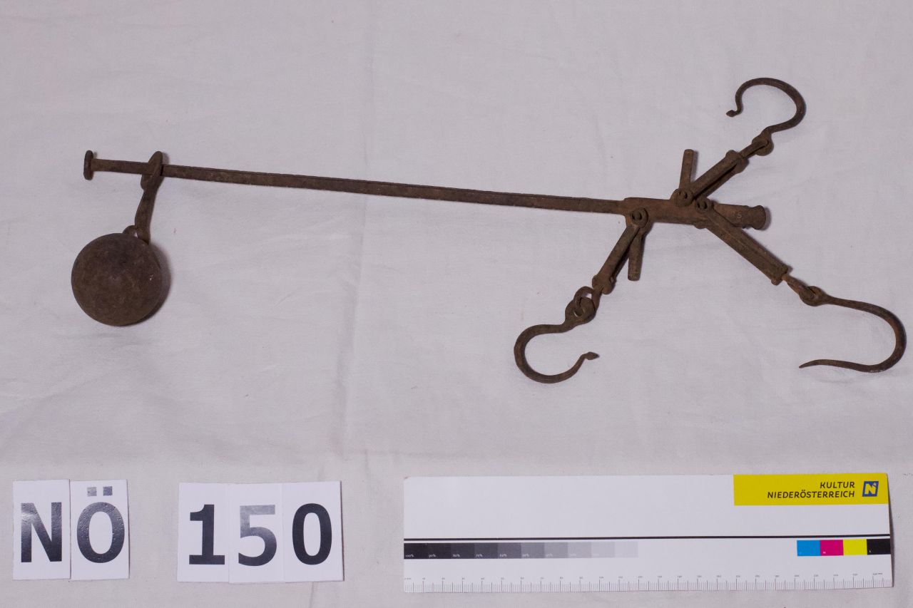 Schnellwage aus Metall. Bestehend aus einem Balken aus gegossenem Metall, mit einer Skala versehen, aus einem kugelförmigen Gewicht und drei Haken.